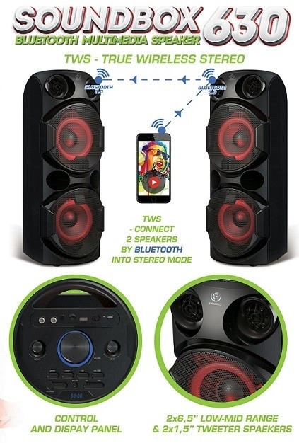 - Λειτουργίες: Bluetooth, TWS, FM ραδιόφωνο, pen drive, κάρτα microSD, AUX, Microphone IN
