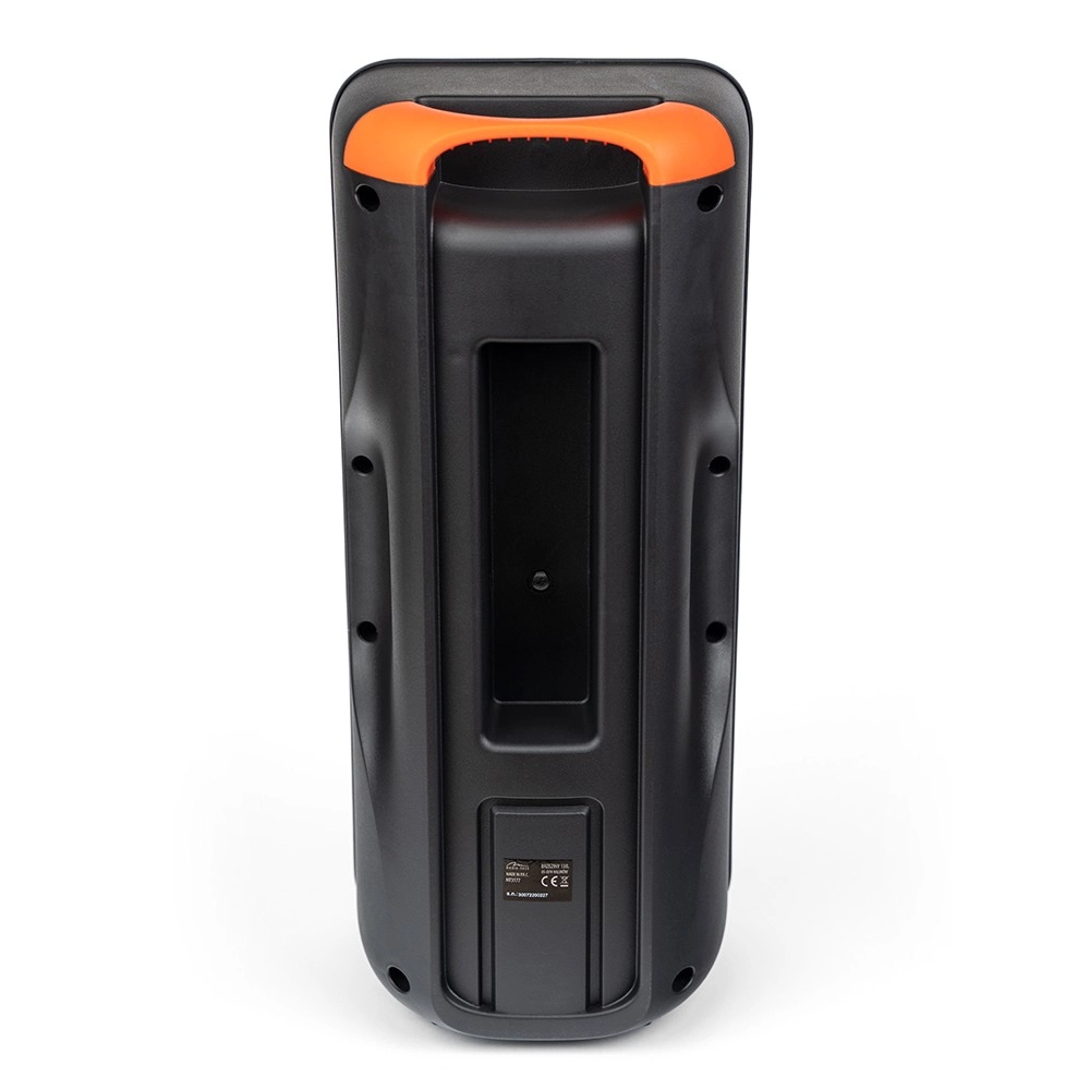 Η μελετημένη κατασκευή περιλαμβάνει μπροστινό πάνελ με κουμπιά ελέγχου, θύρες για διάφορες συνδέσεις και πρακτική λαβή για εύκολη μεταφορά. Στη συσκευασία περιλαμβάνονται επίσης καλώδιο φόρτισης και καλώδιο AUX.