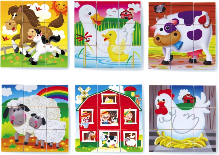 Ανακαλύψτε τη μαγεία της φάρμας με ελαφρούς πλαστικούς κύβους, που πιάνονται εύκολα ακόμη και από μικρά παιδικά χεράκια. Κάθε πλευρά των κύβων σχηματίζει διαφορετική εικόνα, ώστε τα παιδιά να συναρμολογούν 6 διαφορετικά μοτίβα και να μαθαίνουν να αναγνωρίζουν σχήματα, χρώματα και συσχετισμούς.