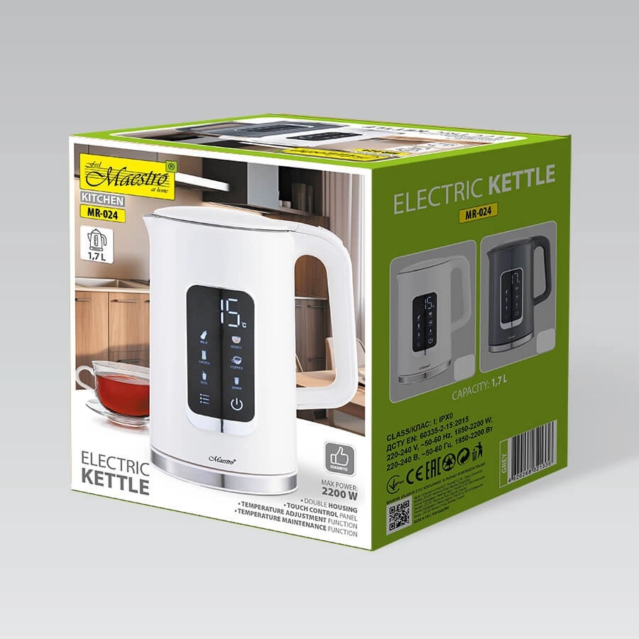 Το εύρος ρύθμισης θερμοκρασίας είναι από 40°C έως 100°C. Ο βραστήρας είναι εξοπλισμένος με ηχητικό σήμα κατά την επίτευξη της επιθυμητής θερμοκρασίας και λειτουργία διατήρησης θερμότητας για 2 ώρες. Η λειτουργία εξοικονόμησης ενέργειας μειώνει την κατανάλωση όταν είναι ενεργό μόνο το κουμπί τροφοδοσίας. Ο κομψός σχεδιασμός και η λειτουργικότητα καθιστούν τον βραστήρα Maestro ιδανικό συμπλήρωμα για κάθε νοικοκυριό.