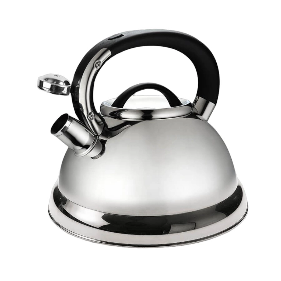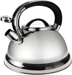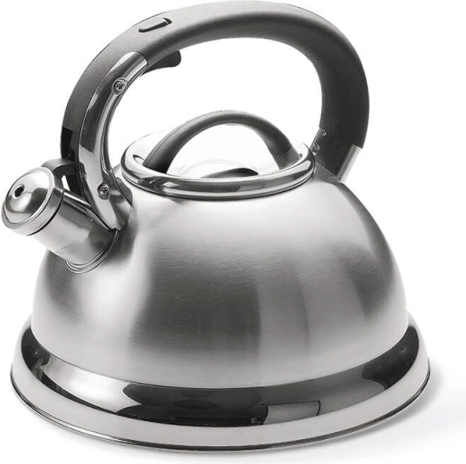 Κομψός βραστήρας με σφυρίχτρα Maestro χωρητικότητας 2,8 l για γρήγορη προετοιμασία ζεστού νερού. Από υψηλής ποιότητας ανοξείδωτο ατσάλι και ανθεκτικό πλαστικό, με δροσερή λαβή, εύκολα αφαιρούμενο καπάκι και πολυεπίπεδη καψωμένη βάση για ομοιόμορφη και γρήγορη θέρμανση. Κατάλληλος για όλους τους τύπους εστιών, συμπεριλαμβανομένης της επαγωγικής.