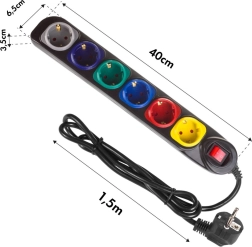 Πρακτικό πολύπριζο MACLEAN με έξι πρίζες και καλώδιο 1,5 m, εξαιρετική επιλογή για σπίτι, γραφείο και εργαστήριο. Οι πρίζες με διαφορετικά χρώματα διευκολύνουν την ταυτοποίηση των συνδεδεμένων συσκευών, ο φωτιζόμενος κεντρικός διακόπτης επιτρέπει γρήγορη αποσύνδεση τροφοδοσίας και οι παιδικές ασφάλειες προσθέτουν ασφάλεια. Κατάλληλο για 250 VAC / 10 A, βαθμός προστασίας IP20.