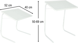 Το τραπεζάκι διπλώνει μέσα σε δευτερόλεπτα και αποθηκεύεται κάτω από το κρεβάτι, σε ντουλάπα ή σε γωνία του δωματίου. Η ευρύχωρη επιφάνεια εργασίας 52 × 40 cm προσφέρει χώρο για laptop, βιβλίο και έγγραφα, ιδανική για home office, διάβασμα και σερβίρισμα.