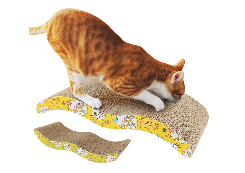 Αυτό το χαρτονένιο ξύστρα-κρεβάτι με κυματιστό προφίλ καλύπτει άψογα τις φυσικές ανάγκες των γατών – προσφέρει ανθεκτική επιφάνεια ξυσίματος και ταυτόχρονα άνετο κρεβάτι για χαλάρωση. Το φυσικό χαρτόνι προσελκύει στο ξύσιμο, μειώνει το στρες και διατηρεί τα νύχια σε καλή κατάσταση, ενώ η παιχνιδιάρικη κίτρινη εκτύπωση ευχαριστεί το μάτι του ιδιοκτήτη.