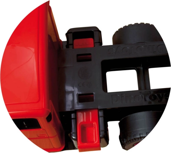 Η καρότσα μπορεί να ασφαλιστεί κατά της ακούσιας ανατροπής, τα φαρδιά τροχά προσφέρουν σταθερότητα σε ποικίλες επιφάνειες και η πιστοποίηση «Ασφαλές και ποιοτικό παιχνίδι» εγγυάται υψηλές προδιαγραφές ασφάλειας και κατασκευής.