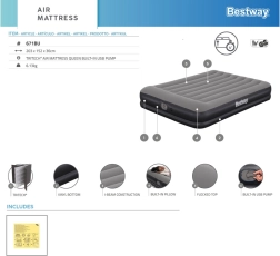 Άνετο διπλό στρώμα Bestway με διαστάσεις 152 × 203 × 36 cm που προσφέρει γρήγορο φούσκωμα με ενσωματωμένη αντλία USB σε 5–6 λεπτά, σταθερή κατασκευή tritech ανθεκτική στη διαστολή, ενσωματωμένο μαξιλάρι για μεγαλύτερη άνεση και μέγ. φορτίο 300 kg. Ιδανικό για το σπίτι και για κάμπινγκ.