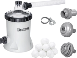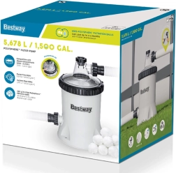 Ισχυρή αντλία πισίνας BESTWAY με παροχή 5678 l/h για κρυστάλλινα καθαρό νερό. Χρησιμοποιεί σφαιρίδια φίλτρανσης Polysphere, που εξασφαλίζουν πολυβάθμια φίλτρανση, μεγαλύτερη διάρκεια ζωής και εύκολη συντήρηση. Ιδανική για υπέργειες πισίνες όγκου 1 100–31 700 l.