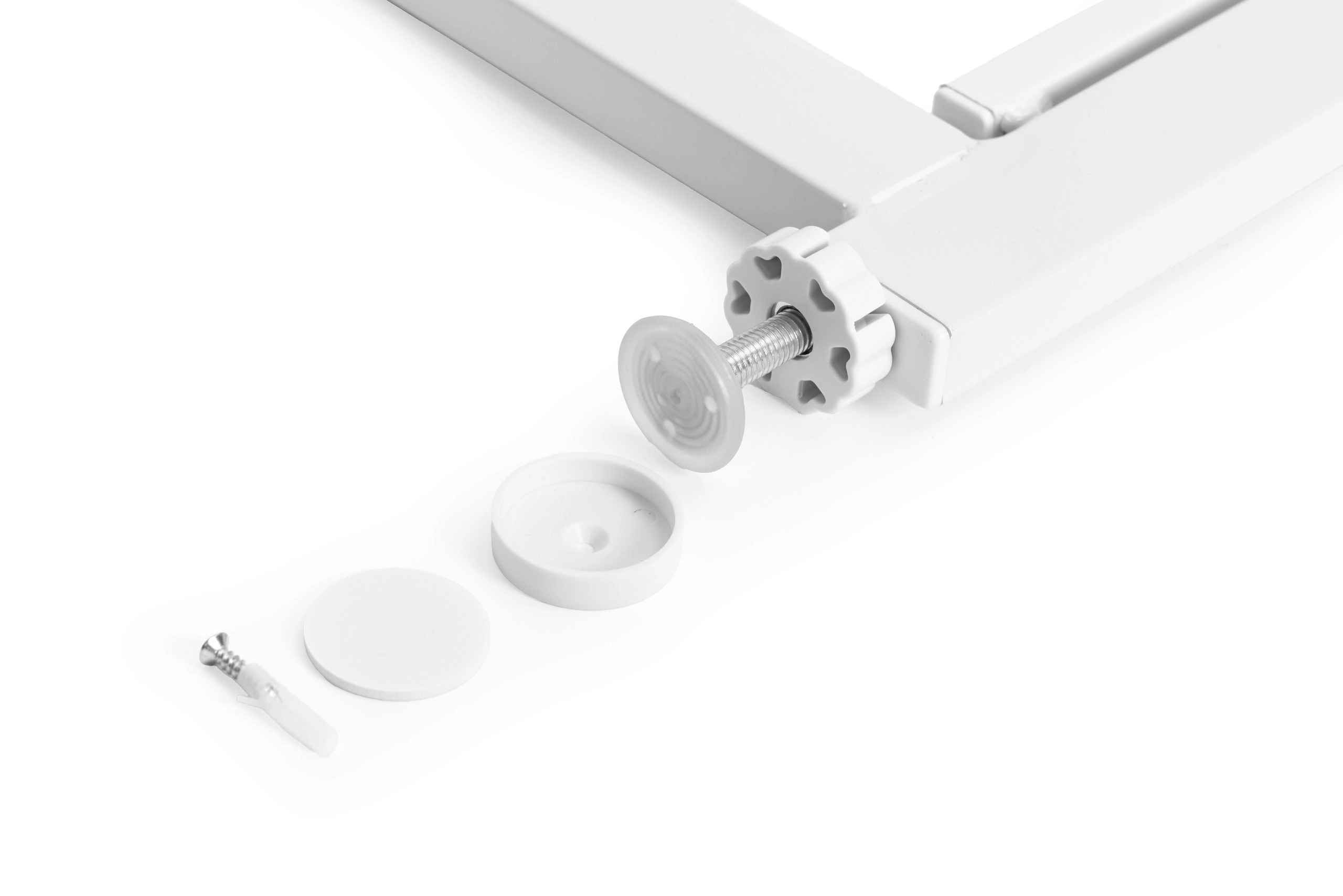 Το κάγκελο προσφέρει ρυθμιζόμενο πλάτος από 74 έως 105 cm και έχει σχεδιαστεί για εύκολη τοποθέτηση χωρίς χρήση εργαλείων. Η πίεσης εγκατάσταση χωρίς τρύπημα επιτρέπει πιο ασφαλή τοποθέτηση χωρίς ζημιές στους τοίχους.