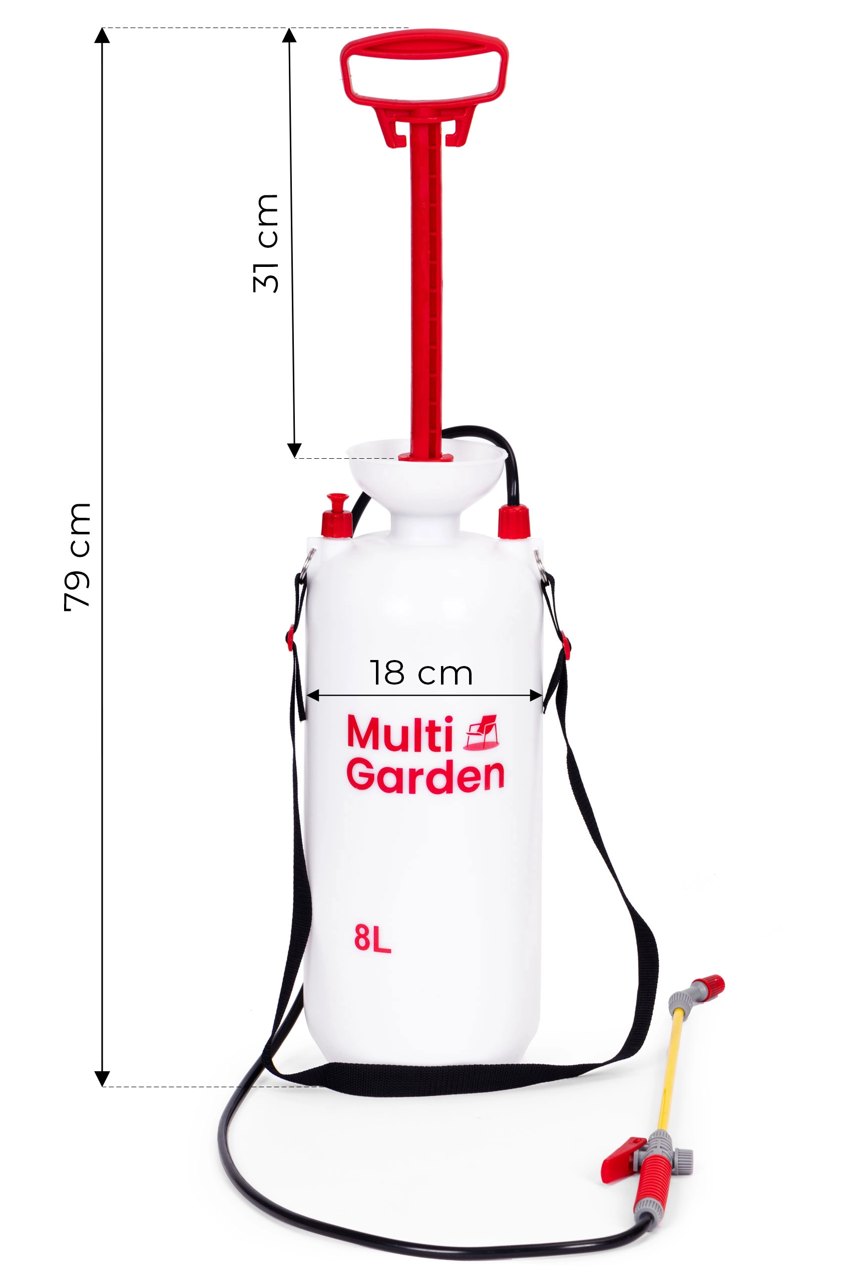 Πρακτικός πιεστικός ψεκαστήρας χωρητικότητας 8 l από τη μάρκα MULTIGARDEN για άνετη φροντίδα κήπου και καθαρισμό γύρω από το σπίτι. Προσφέρει ρυθμιζόμενο ακροφύσιο (επίπεδη και κωνική διασπορά), μακριά λόγχη από υαλονήματα, αντλία εμβόλου, βαλβίδα ασφαλείας και διαβαθμισμένη κλίμακα στη δεξαμενή. Χάρη στη εργονομική λαβή και τον ρυθμιζόμενο ιμάντα ο ψεκαστήρας μεταφέρεται και χειρίζεται άνετα.