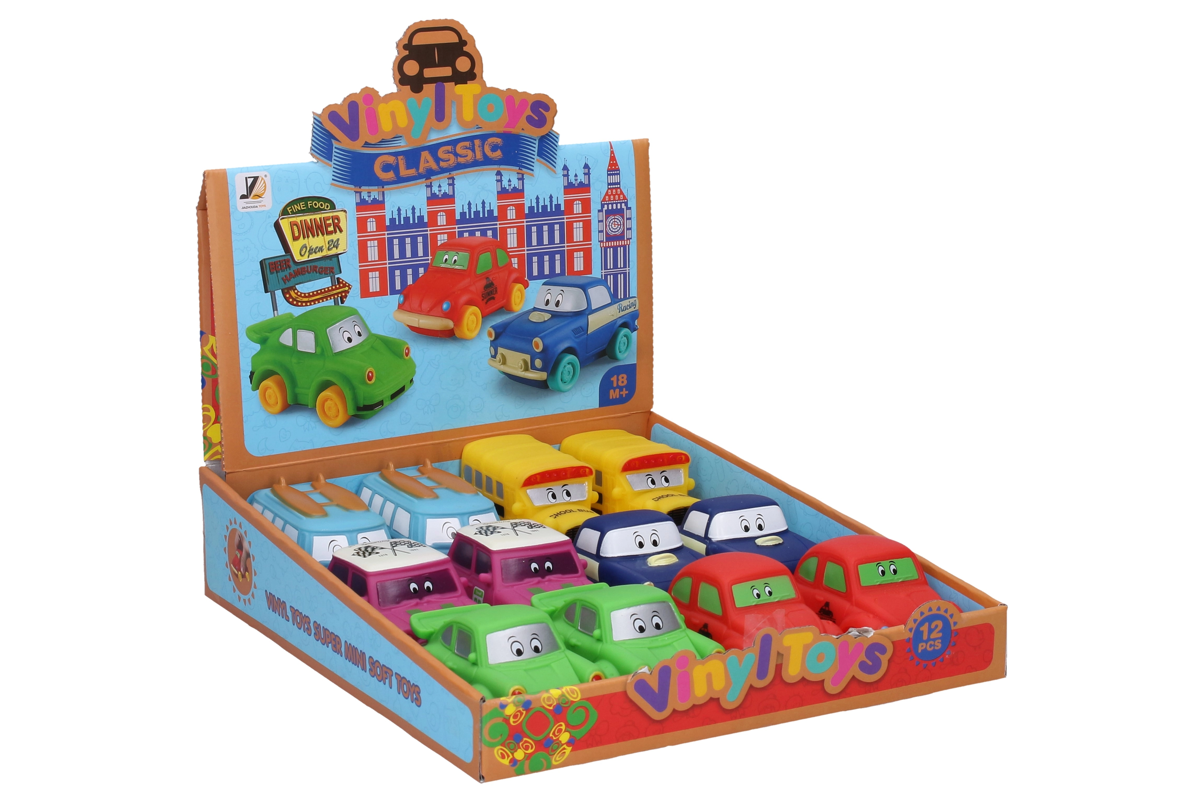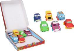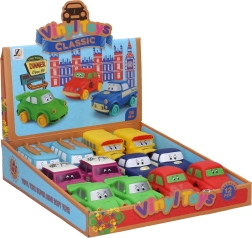 Ελαφρύ αυτοκινητάκι από μαλακό πλαστικό μήκους 9 cm με ελεύθερα κινούμενους τροχούς. Διατίθεται σε 6 παραλλαγές: Σκαραβαίος, Τραμπάντ, σπορ, Mini, λεωφορείο, βαν.