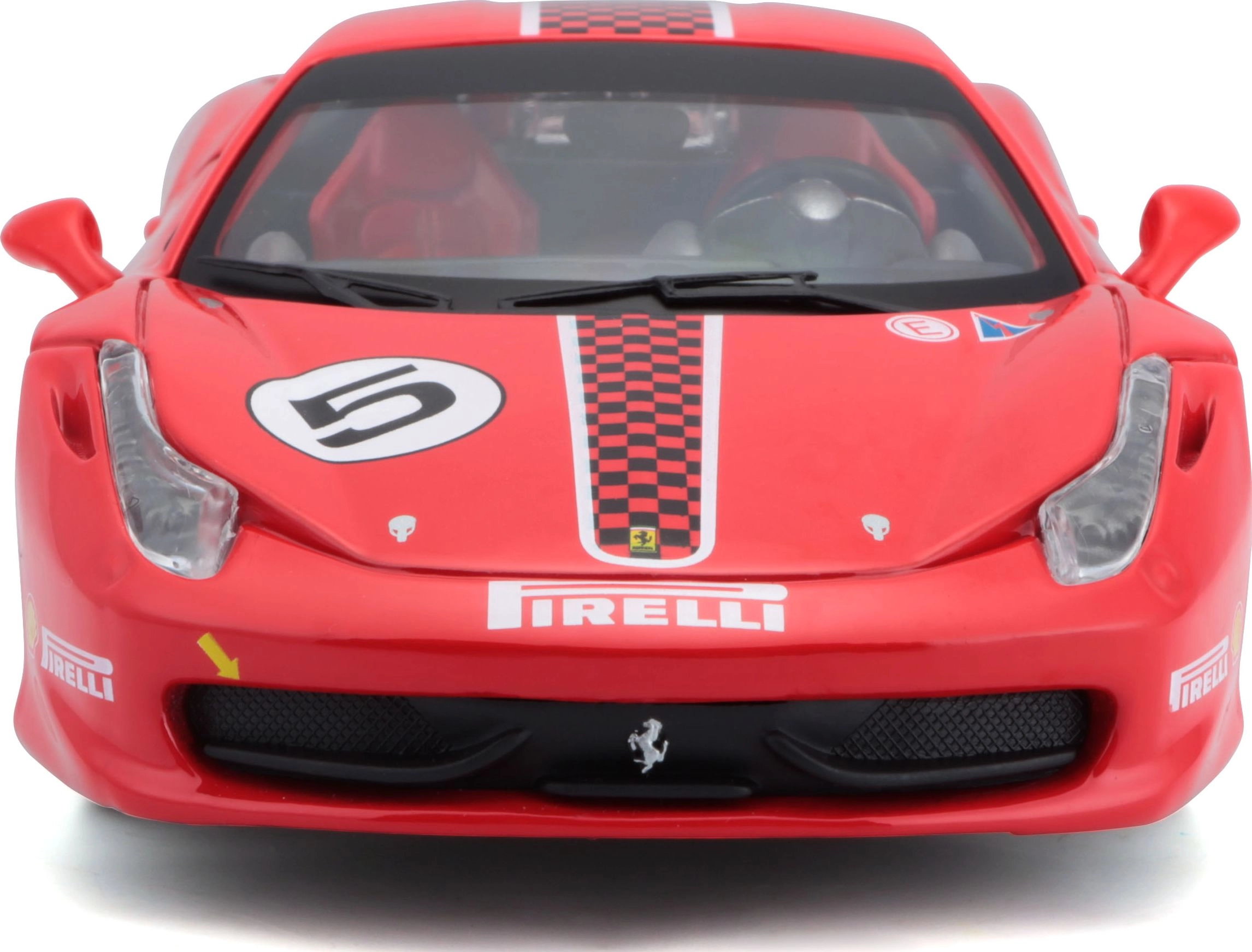 Το κόκκινο βάψιμο, ο αριθμός εκκίνησης 5 και τα λογότυπα χορηγών χαρίζουν στο μοντέλο αυθεντική αγωνιστική εμφάνιση, ιδανική για συλλογές FERRARI.