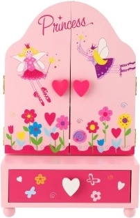 Η ξύλινη τουαλέτα με κοσμηματοθήκη Princess είναι ένα υπέροχο συμπλήρωμα για το παιδικό δωμάτιο. Τον κεντρικό οβάλ καθρέφτη συμπληρώνουν δύο πλαϊνά φτερά για άνετη ρύθμιση της γωνίας. Στο κάτω μέρος θα βρείτε ένα πρακτικό συρτάρι, όπου τα παιδιά μπορούν να αποθηκεύουν τους μικρούς τους θησαυρούς. Ο απαλός διάκοσμος με μοτίβα νεράιδων, λουλουδιών και καρδιών ενισχύει τη φαντασία και τη χαρά του παιχνιδιού.