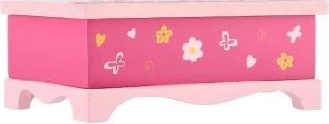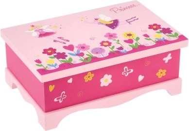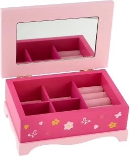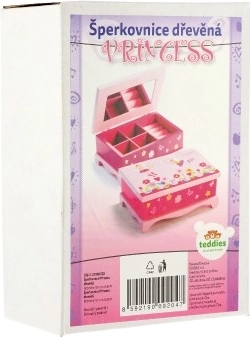 Αυτή η ροζ ξύλινη κοσμηματοθήκη Princess συνδυάζει μαγευτική εμφάνιση με πρακτική διαρρύθμιση. Χάρη στο καθρεφτάκι στην εσωτερική πλευρά του καπακιού και τις πέντε μελετημένες θήκες, βοηθά να διατηρούνται κοσμήματα και μικροαντικείμενα όμορφα τακτοποιημένα. Ο απαλός λουλουδάτος διάκοσμος και η επιγραφή Princess δημιουργούν παραμυθένια ατμόσφαιρα που ταιριάζει ιδανικά σε παιδικό δωμάτιο.