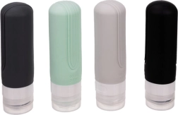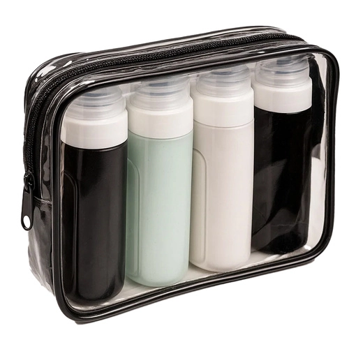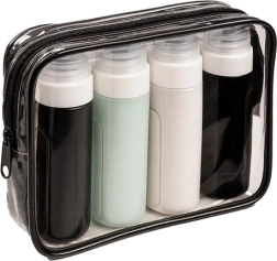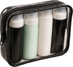 Ταξιδιωτικό σετ καλλυντικών με τέσσερα εύκαμπτα μπουκαλάκια, που είναι σύμφωνα με τις αεροπορικές απαιτήσεις, αδιάβροχα και ιδανικά για το αεροπλάνο. Προσφέρει άνεση και οργάνωση στα ταξίδια σας.