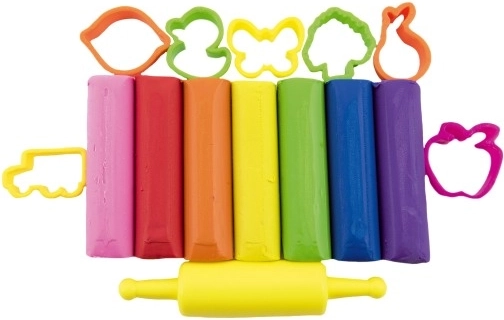 Το σετ περιλαμβάνει πλαστελίνες σε διάφορα χρώματα - ροζ, κόκκινο, πορτοκαλί, κίτρινο, πράσινο, μπλε και μοβ.