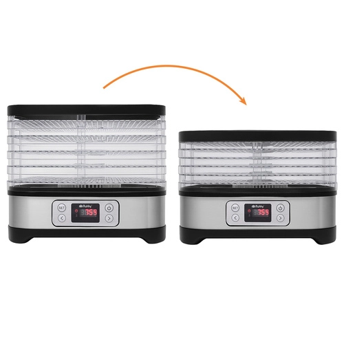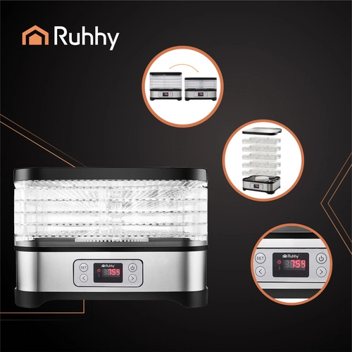 Πολυχρηστικός αφυγραντήρας Ruhhy με ισχύ 400 W επιτρέπει εύκολη αφύγρανση μανιταριών, φρούτων, λαχανικών και βοτάνων. Διαθέτει 5 δίσκους με συνολική χωρητικότητα 10 λίτρων, ρυθμιζόμενη θερμοκρασία (35–70°C) και ευανάγνωστη οθόνη με χρονοδιακόπτη έως 24 ώρες. Ιδανική επιλογή για οικιακή αποθήκευση όλο τον χρόνο.