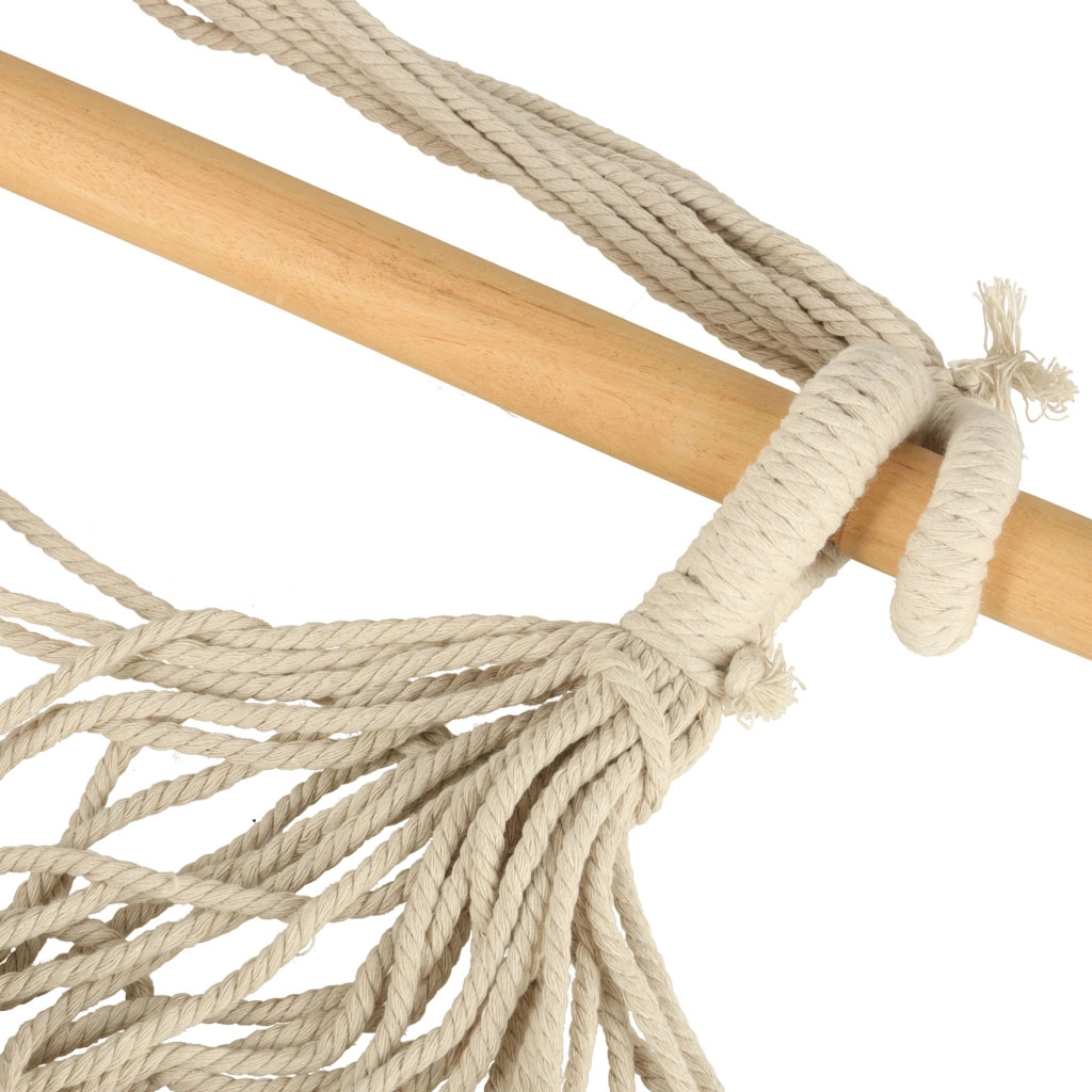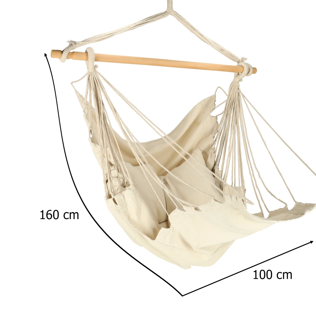 Αυτό το κρεμαστό έπιπλο ταιριάζει σε boho σχεδιασμό και μπορεί ταυτόχρονα να τοποθετηθεί σε κήπο ή εξοχικό. Το υλικό είναι ευχάριστο στην αφή και βοηθά στη μείωση του στρες. Το πακέτο περιλαμβάνει την πολυθρόνα, ξύλινη δοκό, κρεμαστά σχοινιά και δύο άνετα μαξιλάρια. Προσθέστε στη ζωή σας μια πινελιά γαλήνης και άνεσης.