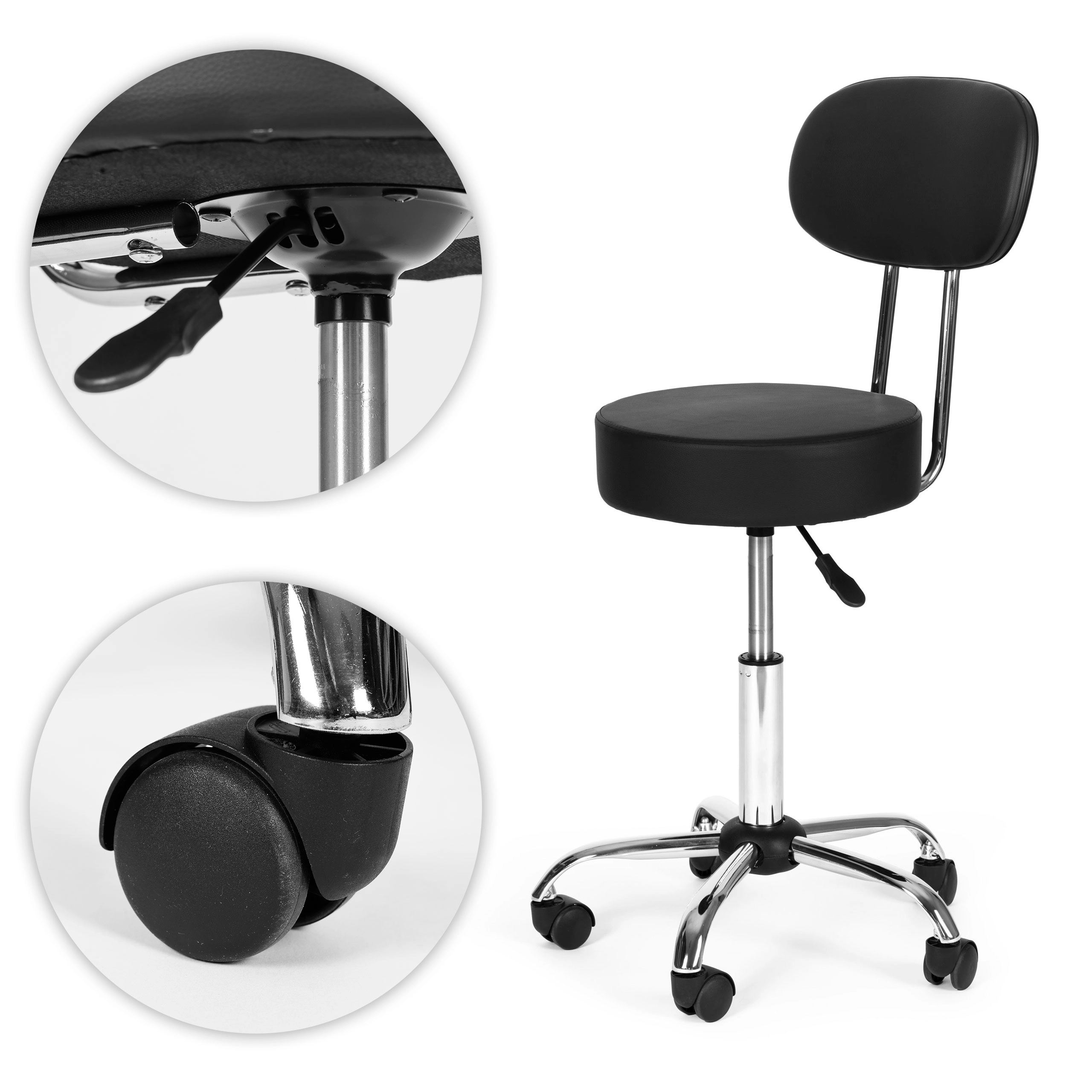 Η βάση πέντε ακτίνων με ροδάκια εγγυάται σταθερότητα και αθόρυβη, ομαλή κίνηση σε διαφορετικούς τύπους δαπέδων χωρίς γρατζουνιές. Το PVC δέρμα είναι ανθεκτικό, καθαρίζεται εύκολα και αντέχει σε επαφή με νερό, έλαια και απολυμαντικά. Έτσι, το σκαμπό είναι ιδανική επιλογή για ινστιτούτα ομορφιάς, κομμωτήρια, χώρους μασάζ και στούντιο τατουάζ.