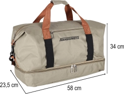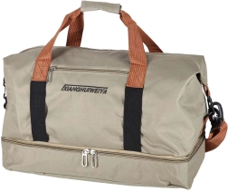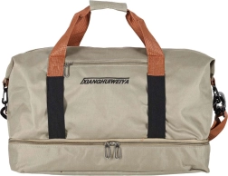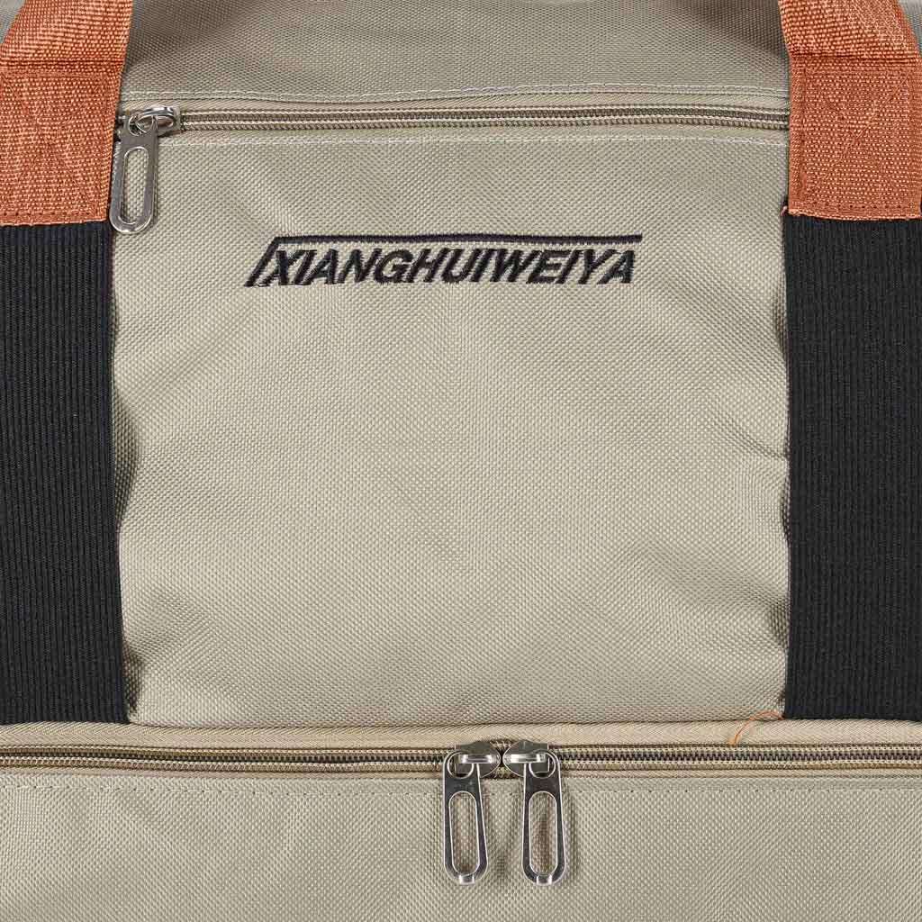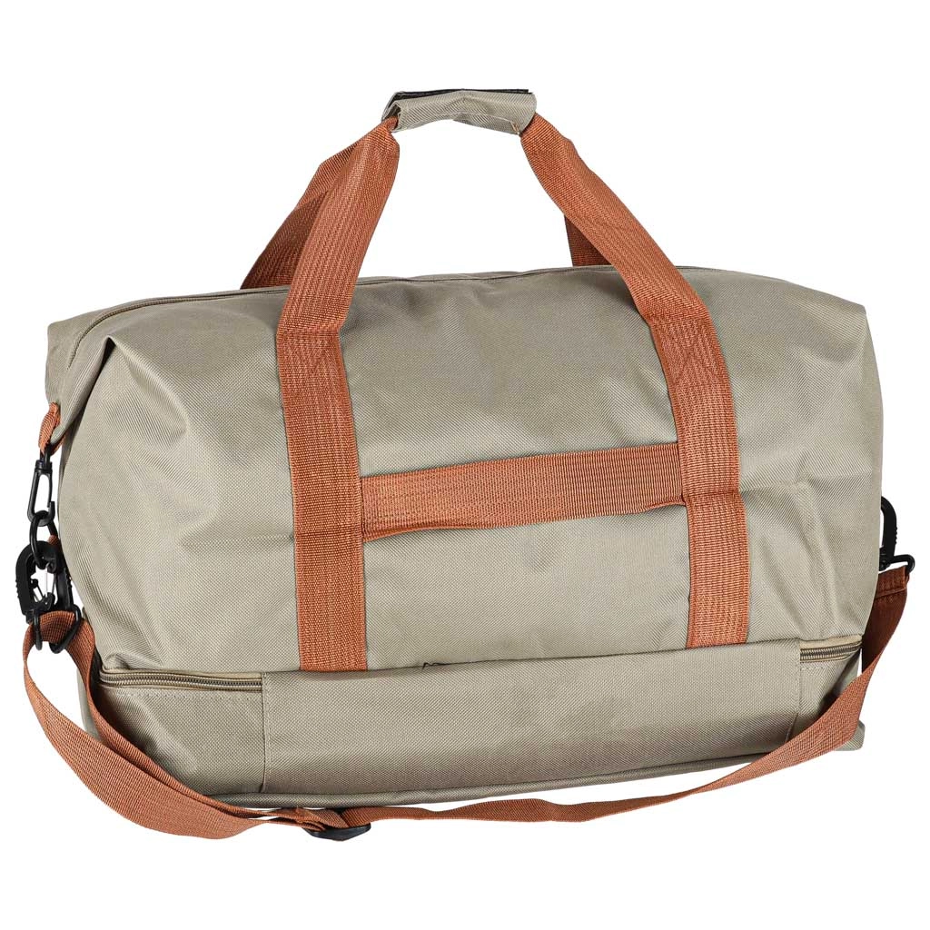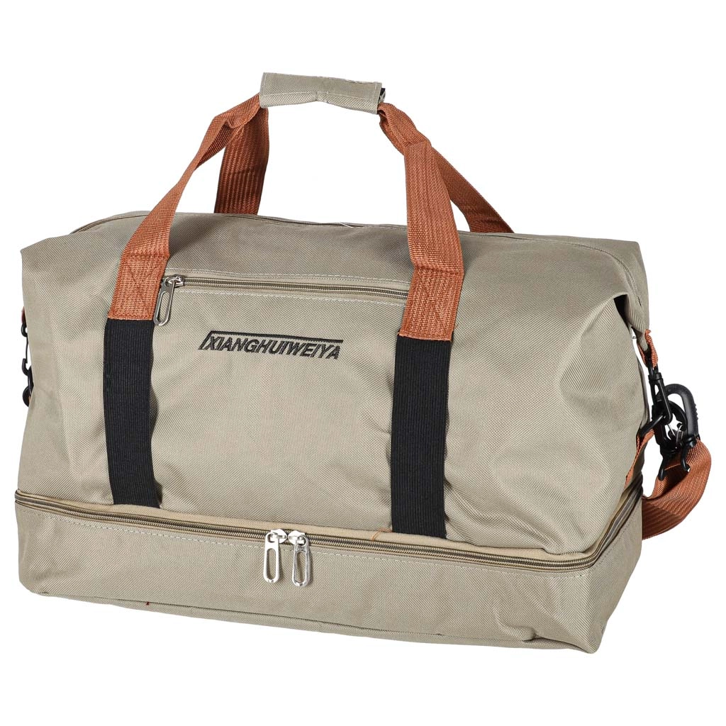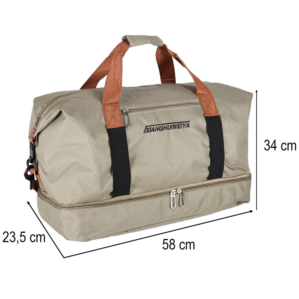 Πρακτική ταξιδιωτική τσάντα σε κομψό μπεζ χρώμα, με ξεχωριστό κάτω διαμέρισμα για παπούτσια, αποσπώμενο και ρυθμιζόμενο ιμάντα ώμου και ανθεκτικό ύφασμα Oxford 600D. Ιδανική ως χειραποσκευή για το αεροπλάνο και τσάντα γυμναστηρίου.