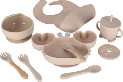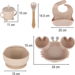 Αυτό το πρακτικό σετ από μαλακή σιλικόνη περιλαμβάνει ό,τι χρειάζεστε για το καθημερινό τάισμα νηπίων: πιάτο σε σχήμα καβουριού με τρία χωρίσματα, μπολ με βεντούζα, ποτηράκι με δύο καπάκια (συμπεριλαμβανομένου καπακιού με καλαμάκι), τέσσερα μαχαιροπίρουνα και ρυθμιζόμενη σαλιάρα με τσέπη. Οι βεντούζες σε πιάτο και μπολ αποτρέπουν το αναποδογύρισμα και το γλίστρημα των σκευών, ενώ τα χωρίσματα βοηθούν να διαχωρίζονται οι μερίδες.