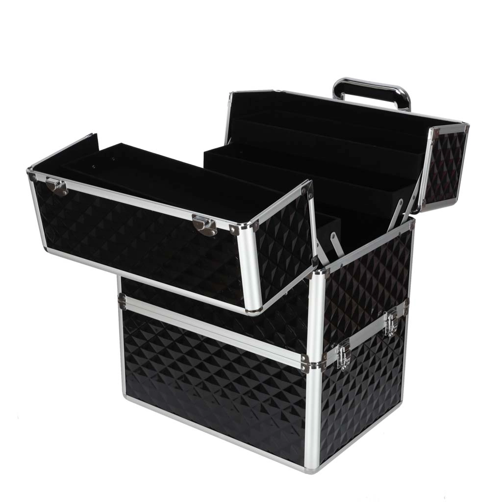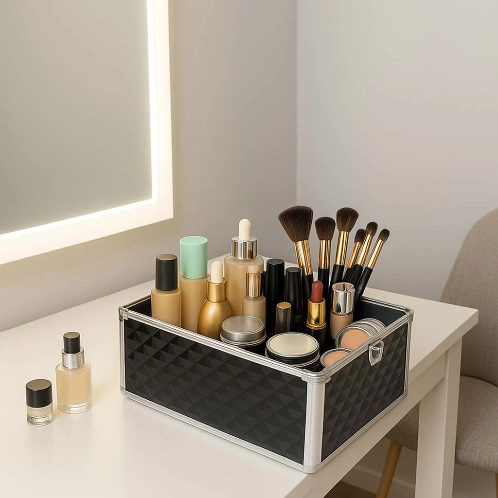Αυτό το μεγάλο βαλιτσάκι καλλυντικών τύπου “train case” προσφέρει έξυπνη διαρρύθμιση: με το άνοιγμα του καπακιού ανασύρονται τέσσερα ευδιάκριτα χωρίσματα, ενώ στο κάτω μέρος υπάρχει μια βαθιά θήκη για μεγαλύτερα προϊόντα, μπουκαλάκια και εργαλεία. Η ανθεκτική κατασκευή με αλουμινένιες ακμές και ενισχυμένες γωνίες προστατεύει το περιεχόμενο τόσο στα ταξίδια όσο και στην καθημερινή χρήση.