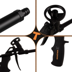 Το ανθεκτικό ολόσωμο μεταλλικό σώμα εξασφαλίζει αξιοπιστία και μεγάλη διάρκεια ζωής ακόμη και σε εντατική χρήση. Η εργονομική λαβή με αντιολισθητική επιφάνεια εφαρμόζει άνετα στο χέρι και ελαχιστοποιεί την κόπωση κατά τη μακρά εργασία. Το πιστόλι είναι συμβατό με τις περισσότερες κοινές φιάλες αφρού PU.