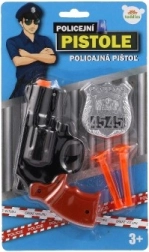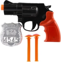 - Περιεχόμενο συσκευασίας: πλαστικό πιστόλι (περίπου 15 εκ.), 2× βέλος με βεντούζα, αστυνομικό σήμα