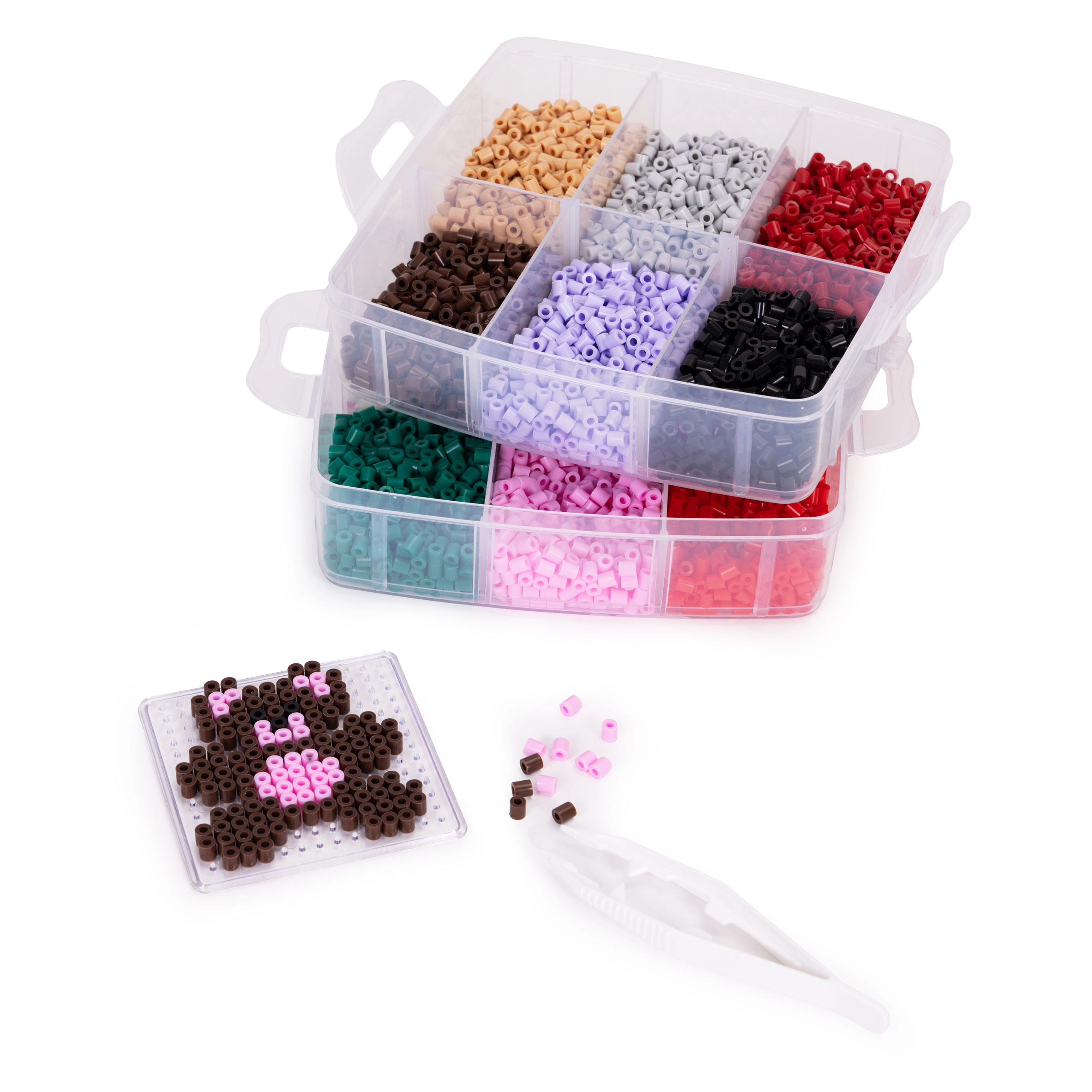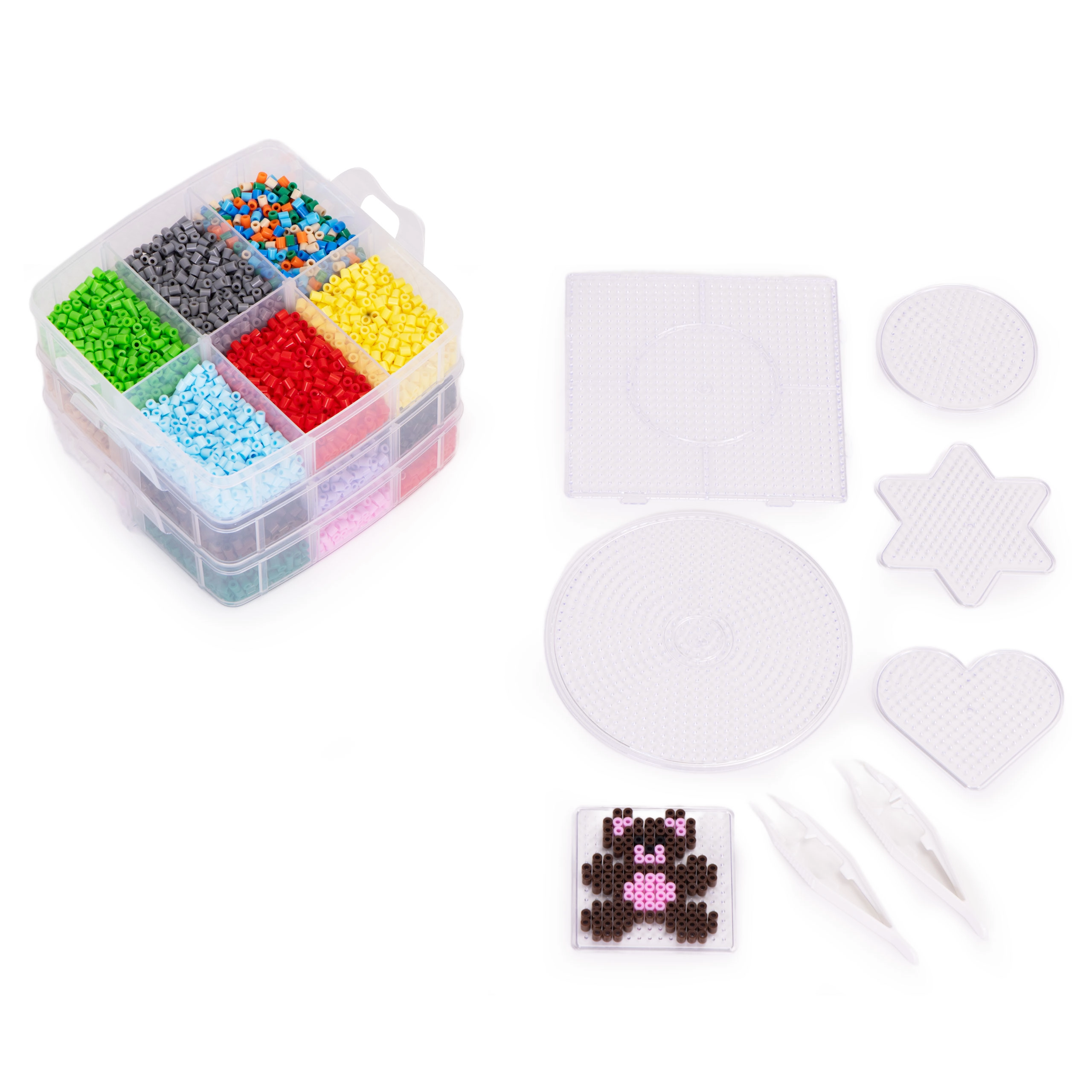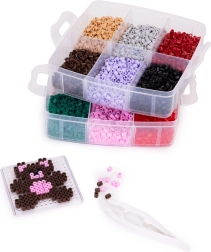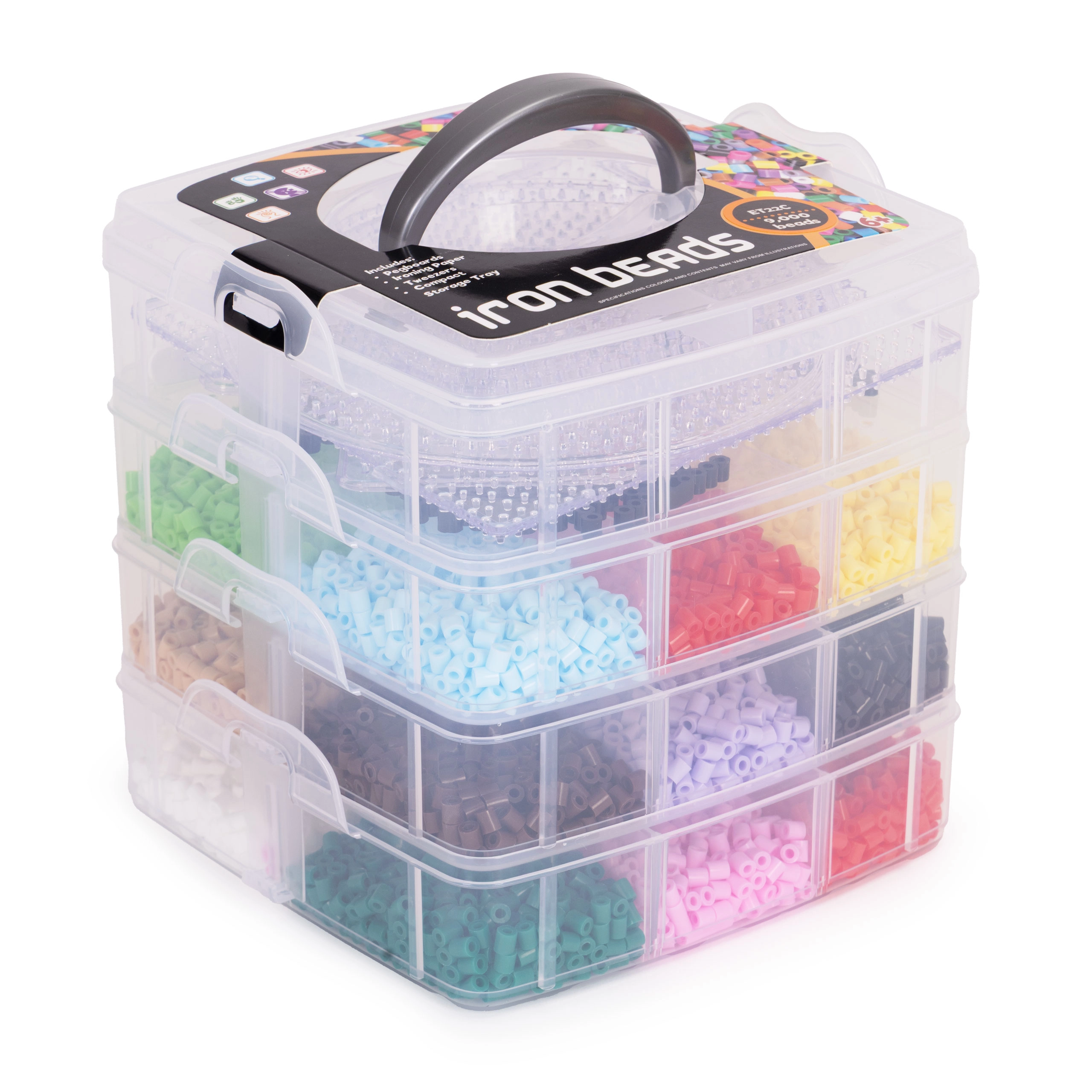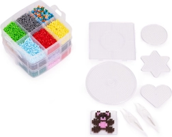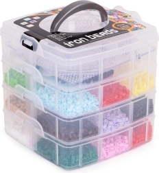 Περιεχόμενα συσκευασίας: έως 9000 χάντρες σε πολλά χρώματα, 6 βάσεις (κύκλος, τετράγωνο, αστέρι, καρδιά κ.ά.), 2 τσιμπιδάκια, χαρτιά σιδερώματος, πρότυπα σχεδίων και ευρύχωρος οργανωτής με διαμερίσματα. Χάρη στο στοιβαζόμενο κουτί, όλα είναι τακτοποιημένα και έτοιμα για περισσότερη δημιουργία στο σπίτι και καθ’ οδόν.