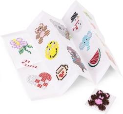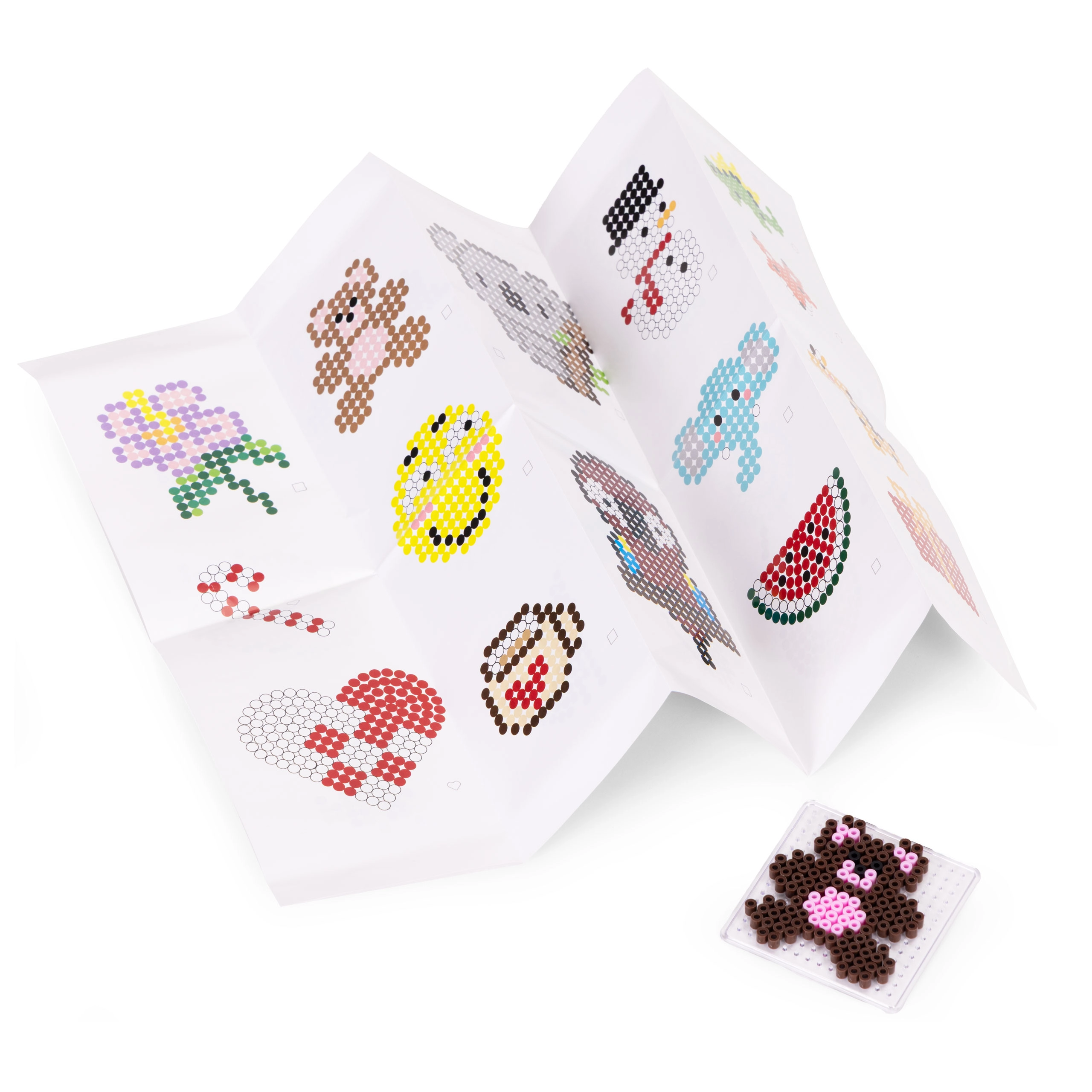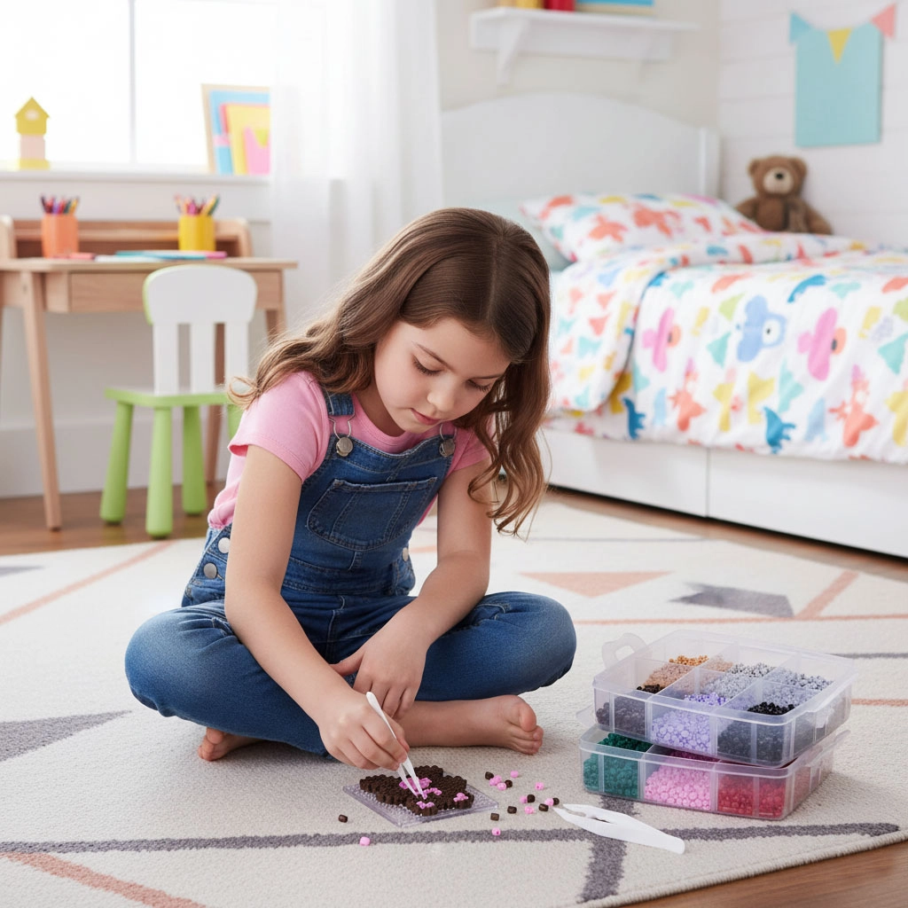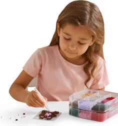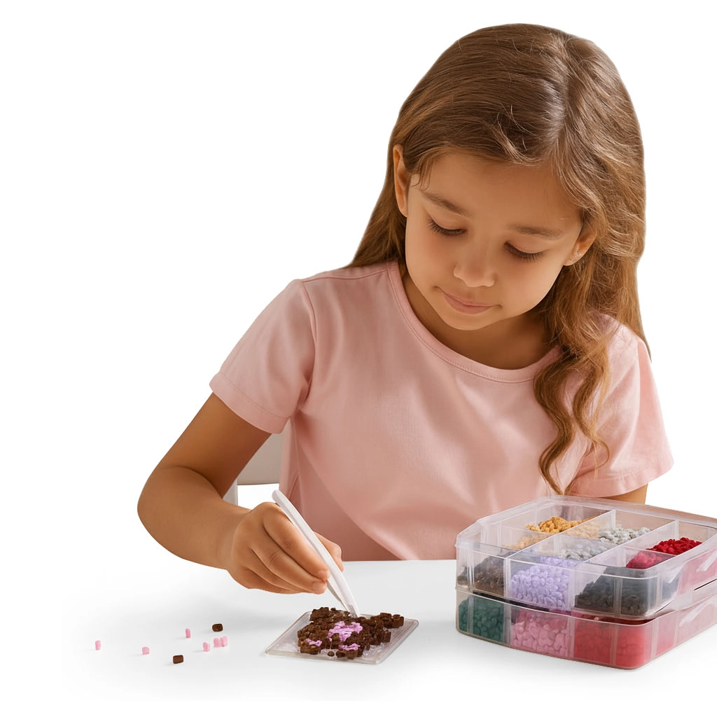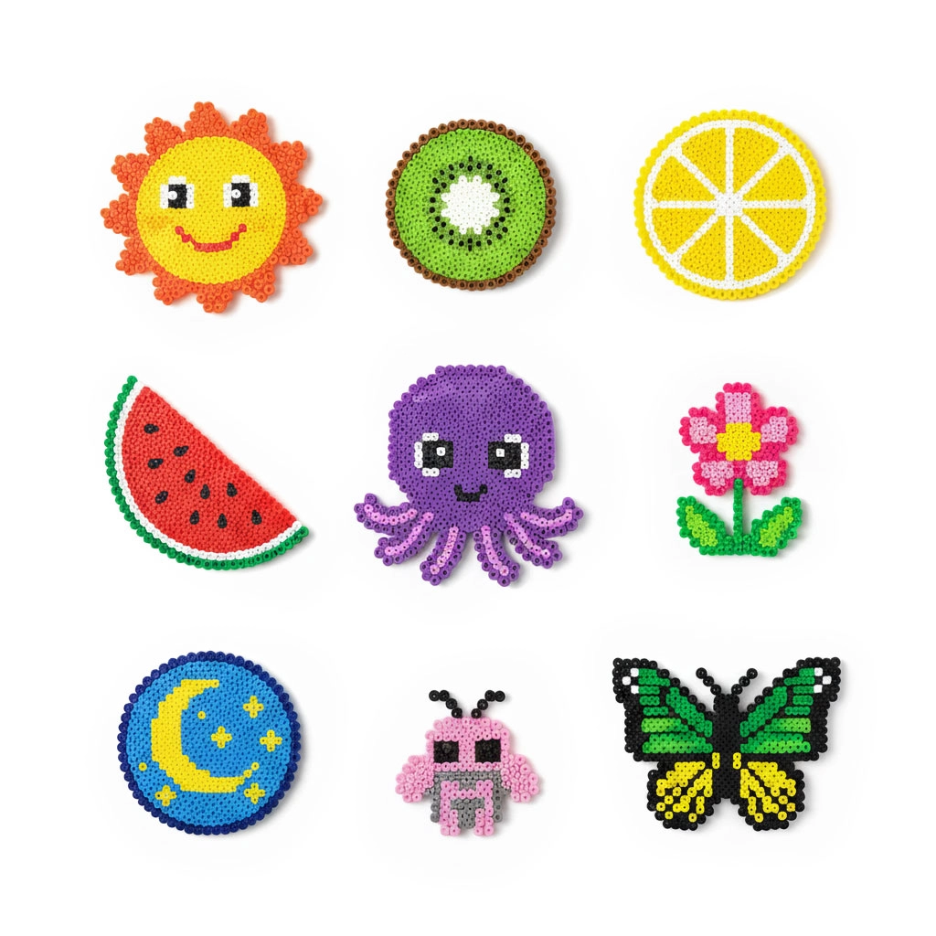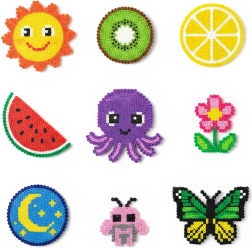 Μεγάλο απόθεμα χαντρών σε ευρεία παλέτα χρωμάτων επιτρέπει στα παιδιά να δημιουργούν ζωάκια, σύμβολα, διακοσμητικά και “pixel art” εικόνες – από απλά μοτίβα έως περίτεχνα σχέδια.