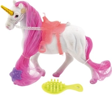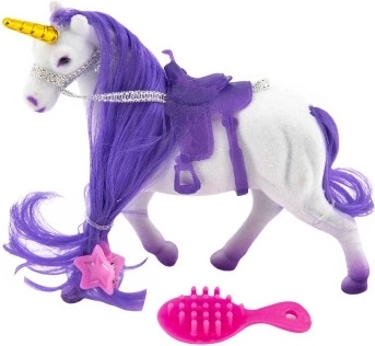 Αυτός ο κομψός μονόκερος θα ενθουσιάσει κάθε παιδί που αγαπά τα μαγικά πλάσματα και τον κόσμο της φαντασίας. Χάρη στην απαλή, βελούδινη υφή και τη χαίτη για χτένισμα, οι μικροί κομμωτές θα απολαύσουν πολλή δημιουργική διασκέδαση. Περιλαμβάνονται επίσης αξεσουάρ περιποίησης χαίτης και σέλα για άνετες βόλτες στον φανταστικό κόσμο.