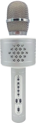 Ασύρματο μικρόφωνο καραόκε με Bluetooth, ιδανικό για πάρτι στο σπίτι και τραγούδι εν κινήσει. Προσφέρει εύκολη σύνδεση μέσω Bluetooth, AUX ή κάρτας TF, ισχυρά ηχεία 2×3 W, ρυθμίσεις έντασης, μουσικής και ηχούς και μεγάλη αυτονομία έως 14 ώρες. Η ασημί κατασκευή είναι κομψή και προσφέρει εξαιρετική διασκέδαση για όλη την οικογένεια.