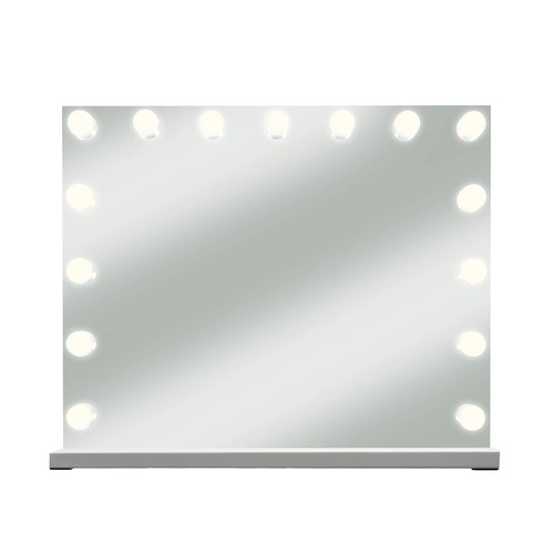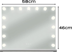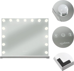 Κομψός καθρέφτης μακιγιάζ Soulima LED 58 × 46 cm που συνδυάζει το στυλ HOLLYWOOD με επαγγελματικό φωτισμό. 15 οικονομικές λυχνίες LED, αισθητήριος πίνακας αφής με ομαλή ρύθμιση φωτεινότητας και 3 θερμοκρασίες φωτός (ζεστό, ουδέτερο, ψυχρό) εξασφαλίζουν ιδανικές συνθήκες για μακιγιάζ, περιποίηση επιδερμίδας και διαμόρφωση μαλλιών. Μεγάλη επιφάνεια, δυνατότητα τοποθέτησης σε επιφάνεια ή κρέμασης και διπλή τροφοδοσία USB/230 V τον καθιστούν πρακτικό και κομψό αξεσουάρ για μπουντουάρ ή ινστιτούτο ομορφιάς.