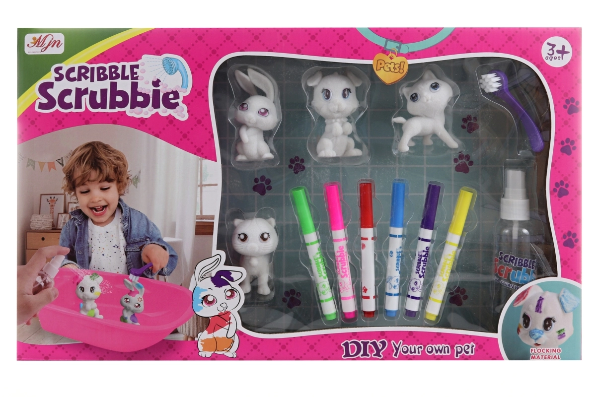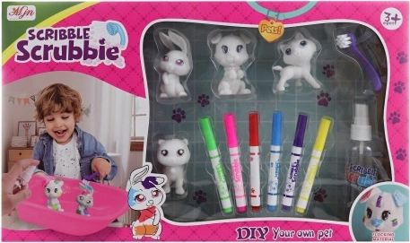 - 4 πλαστικά ζωάκια, 6 χρώματα, λεκανάκι, βουρτσάκι, μπουκαλάκι με ψεκαστήρα