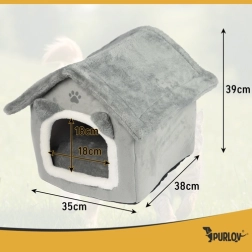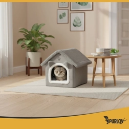 Αναζητάτε ένα ζεστό καταφύγιο για τη γάτα σας; Το σπιτάκι-κρεβατάκι Purlov προσφέρει μαλακό λούτρινο περιβάλλον, αφαιρούμενο μαξιλάρι για εύκολο πλύσιμο, αποσπώμενη στέγη με φερμουάρ για γρήγορη τακτοποίηση και αντιολισθητικό πάτο για ασφάλεια. Ο κομψός γκρι σχεδιασμός ταιριάζει υπέροχα σε κάθε εσωτερικό χώρο.