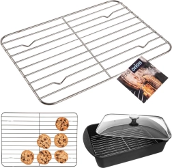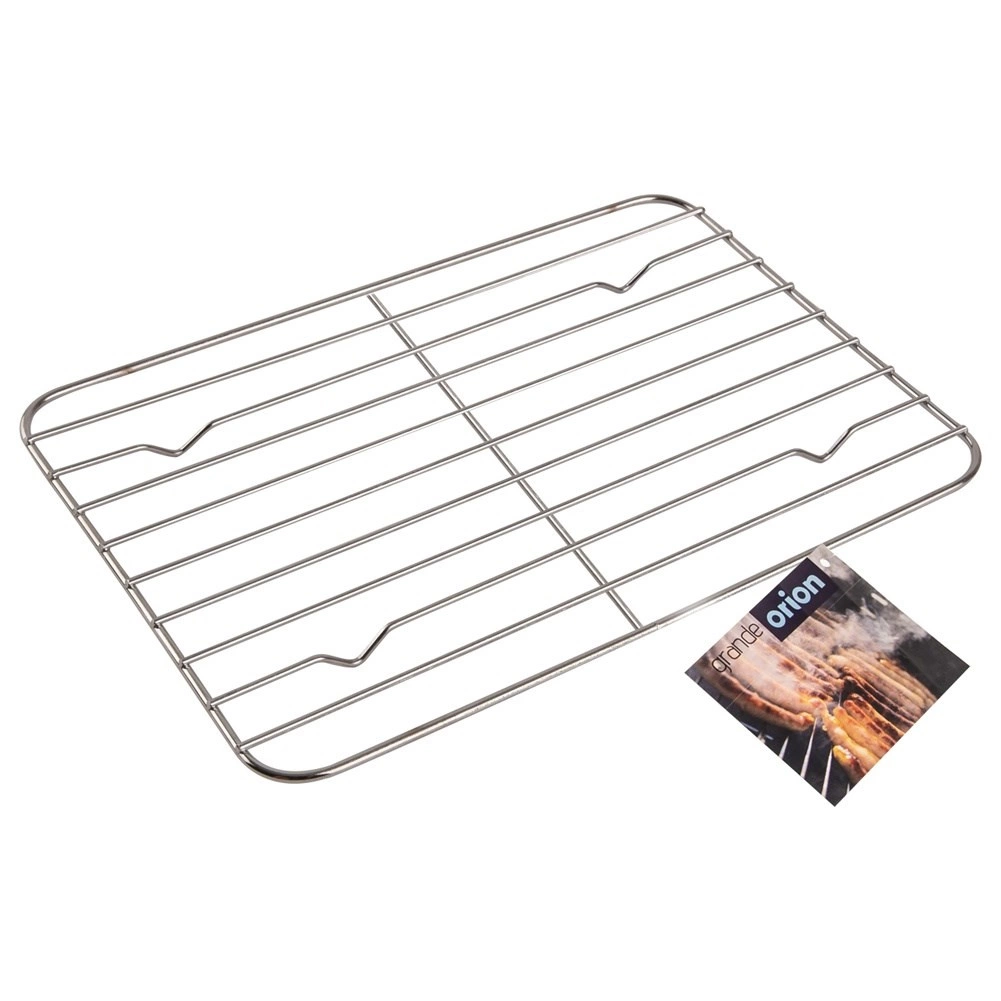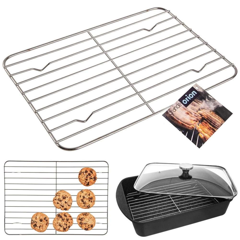 Πολυχρηστική μεταλλική σχάρα για ταψί και σχάρα ψύξης σε ένα, διαστάσεων 32 × 23 × 1,2 εκ. Ιδανική για ψήσιμο κρέατος χωρίς περιττά λιπαρά, για ψύξη και διακόσμηση τούρτων και γλυκισμάτων καθώς και ως ανθεκτική βάση θερμότητας για ζεστά σκεύη. Κατασκευασμένη από χρωμιωμένο χαλύβδινο σύρμα για μεγάλη αντοχή.