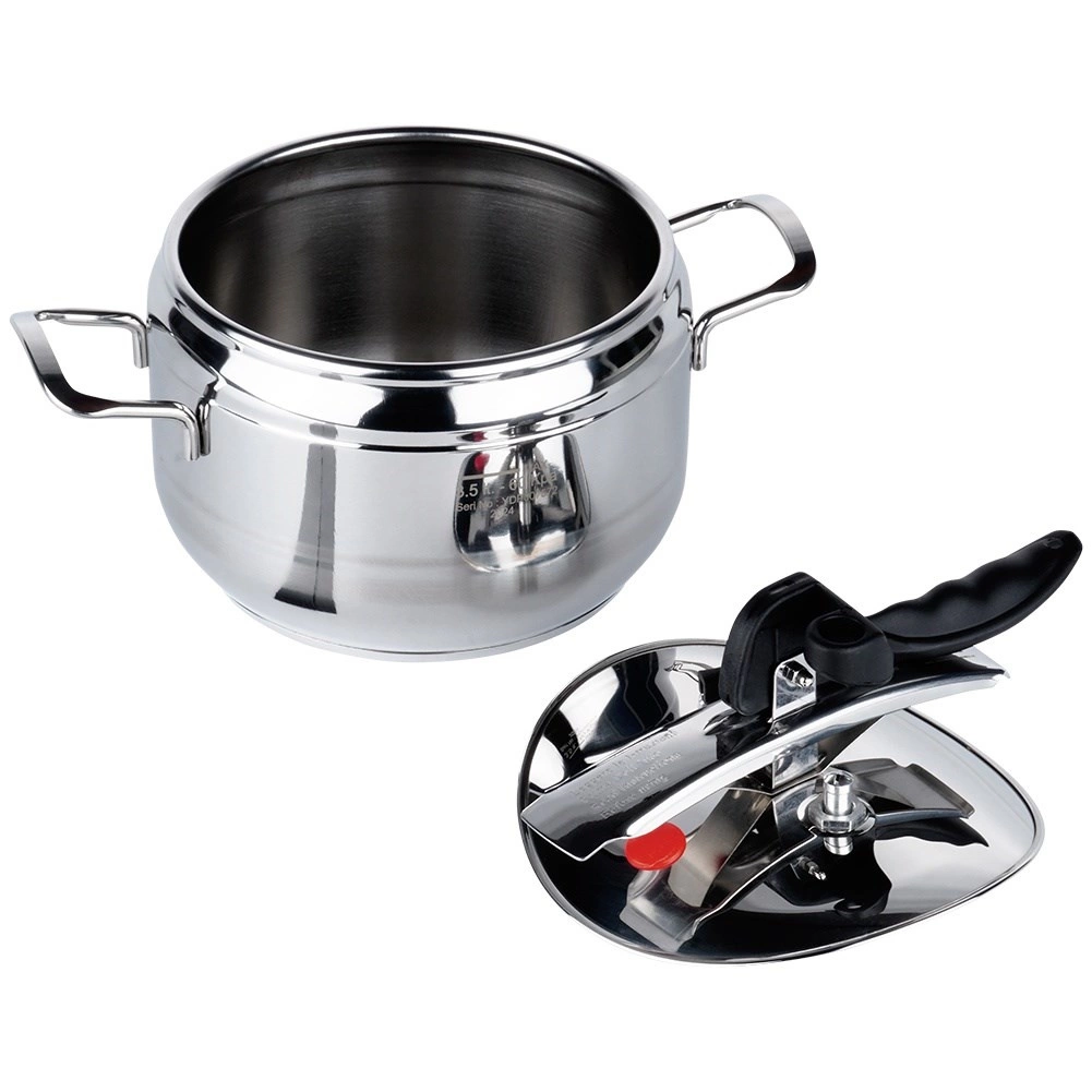 Συμπαγής ανοξείδωτη χύτρα ταχύτητας χωρητικότητας 3,5 l για γρήγορο, οικονομικό και υγιεινό μαγείρεμα υπό πίεση. Χάρη στον τριπλό πάτο, τη ρύθμιση πίεσης και τις δύο βαλβίδες ασφαλείας μειώνει τον χρόνο προετοιμασίας και εξοικονομεί ενέργεια. Κατάλληλη για αέριο, ηλεκτρικό, κεραμικό, αλογόνου και επαγωγικό και πλένεται στο πλυντήριο πιάτων (χωρίς καπάκι).