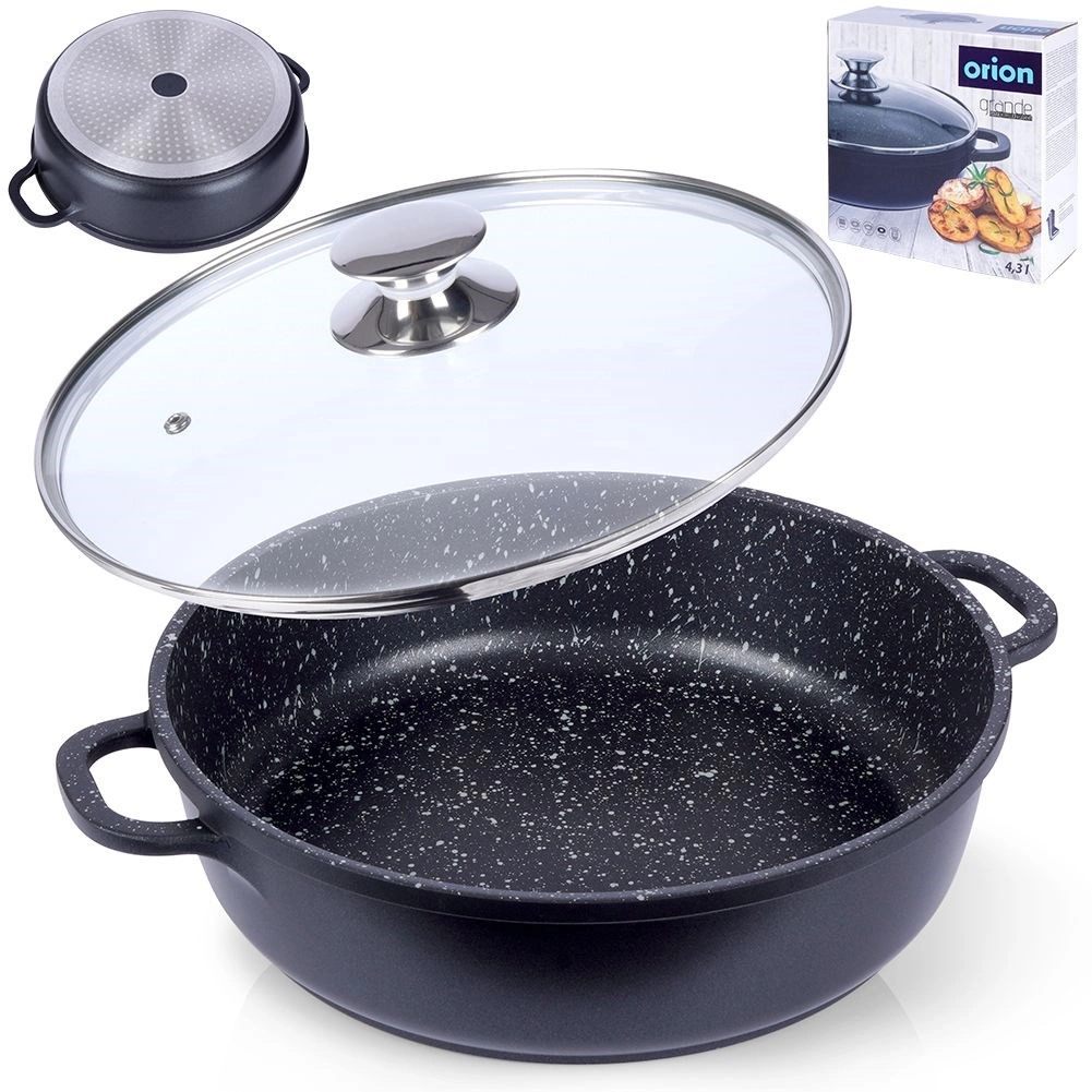 Ανθεκτικό αλουμινένιο τηγάνι σε κομψό μαύρο φινίρισμα με όψη πέτρας, με υψηλής ποιότητας γρανιτένια αντικολλητική επιφάνεια PFLUON εσωτερικά, που αντέχει σε υψηλές θερμοκρασίες και στις γρατζουνιές. Το γυάλινο καπάκι με ανοξείδωτο περίβλημα και βαλβίδα ατμού διευκολύνει τον έλεγχο του φαγητού και διατηρεί την υγρασία για ζουμερά αποτελέσματα.