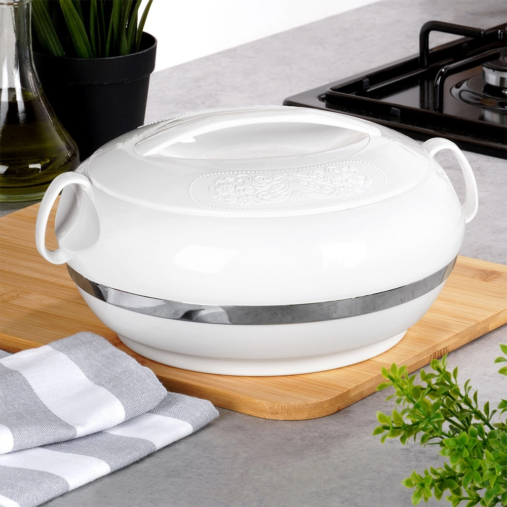 Η λευκή εμφάνιση με διακοσμητικό ανάγλυφο και μεταλλική λωρίδα ολοκληρώνει υπέροχα ένα στρωμένο τραπέζι και μια μοντέρνα κουζίνα.