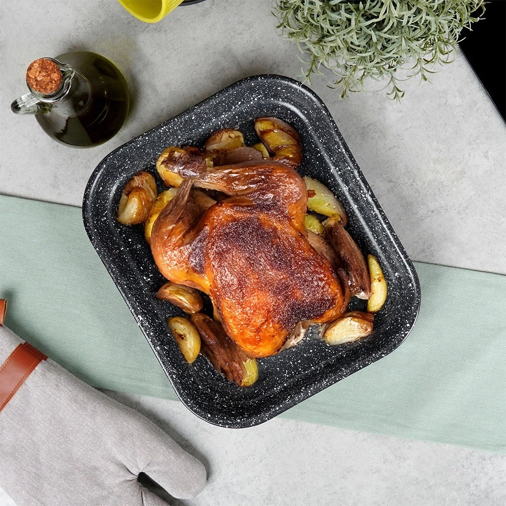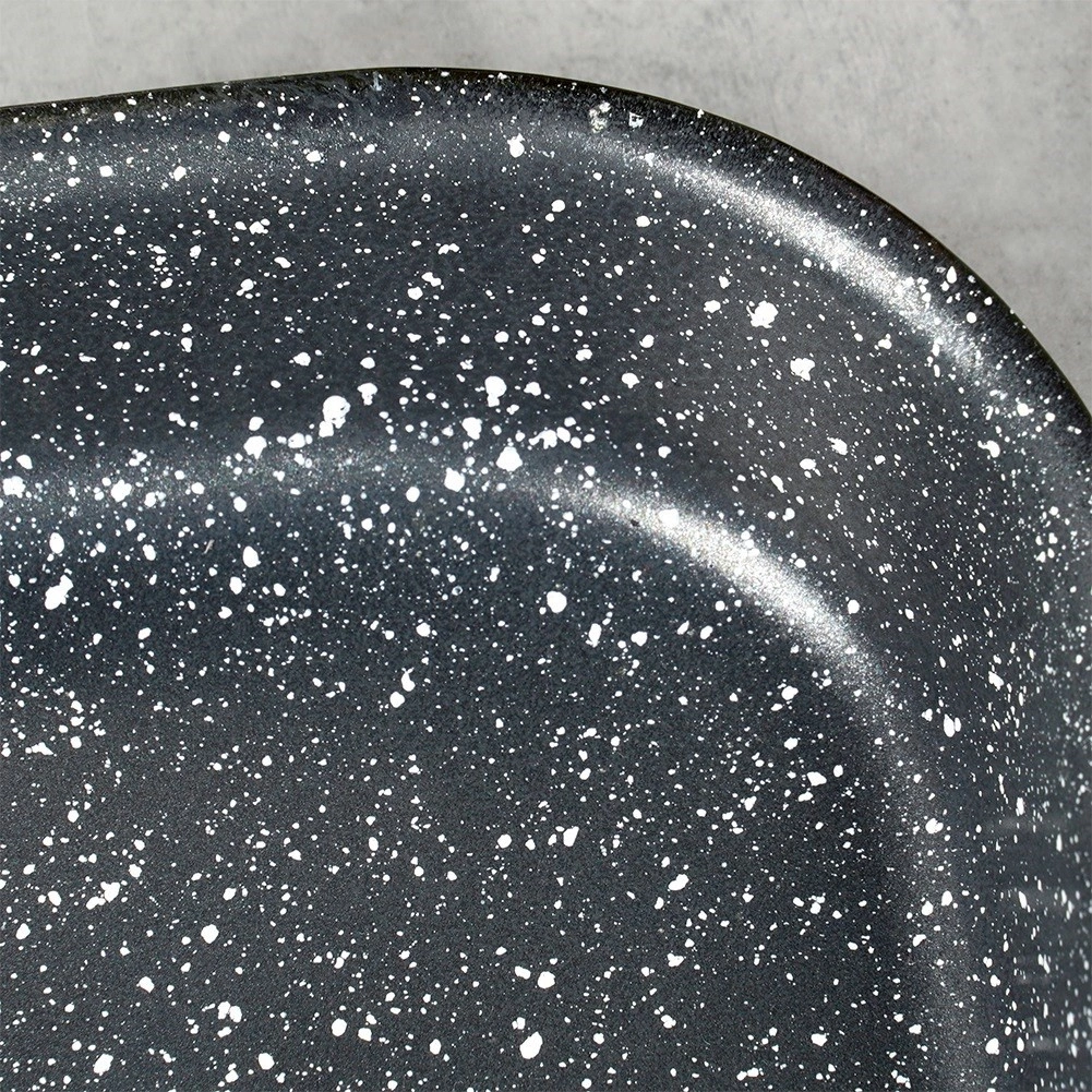 Ανθεκτικό ατσάλινο ταψί με σμαλτωμένο σώμα και γρανιτένια, υψηλής αντοχής αντικολλητική επιφάνεια που εξασφαλίζει ομοιόμορφο ψήσιμο και εύκολη αναστροφή των φαγητών. Η εσωτερική διάσταση 27 × 23 × 4 cm είναι ιδανική για ψήσιμο κοτόπουλου, λαχανικών, κέικ και σπιτικής πίτσας.