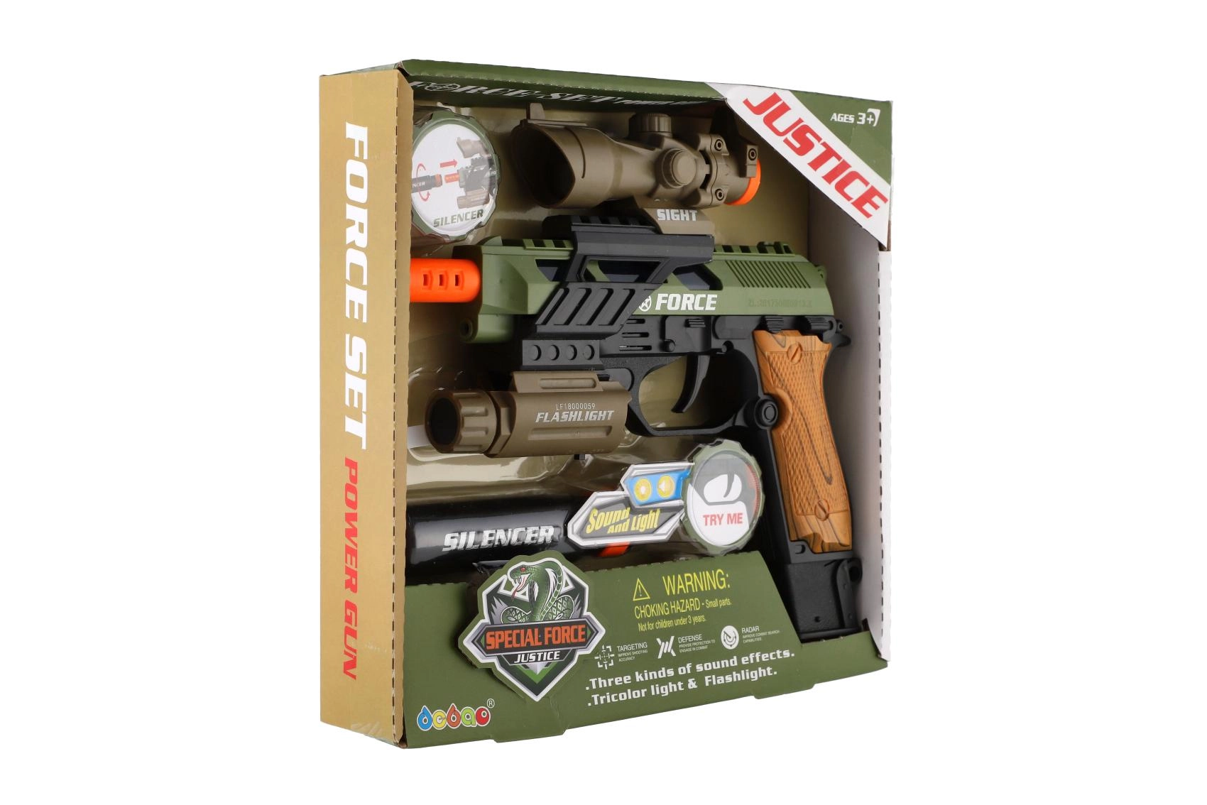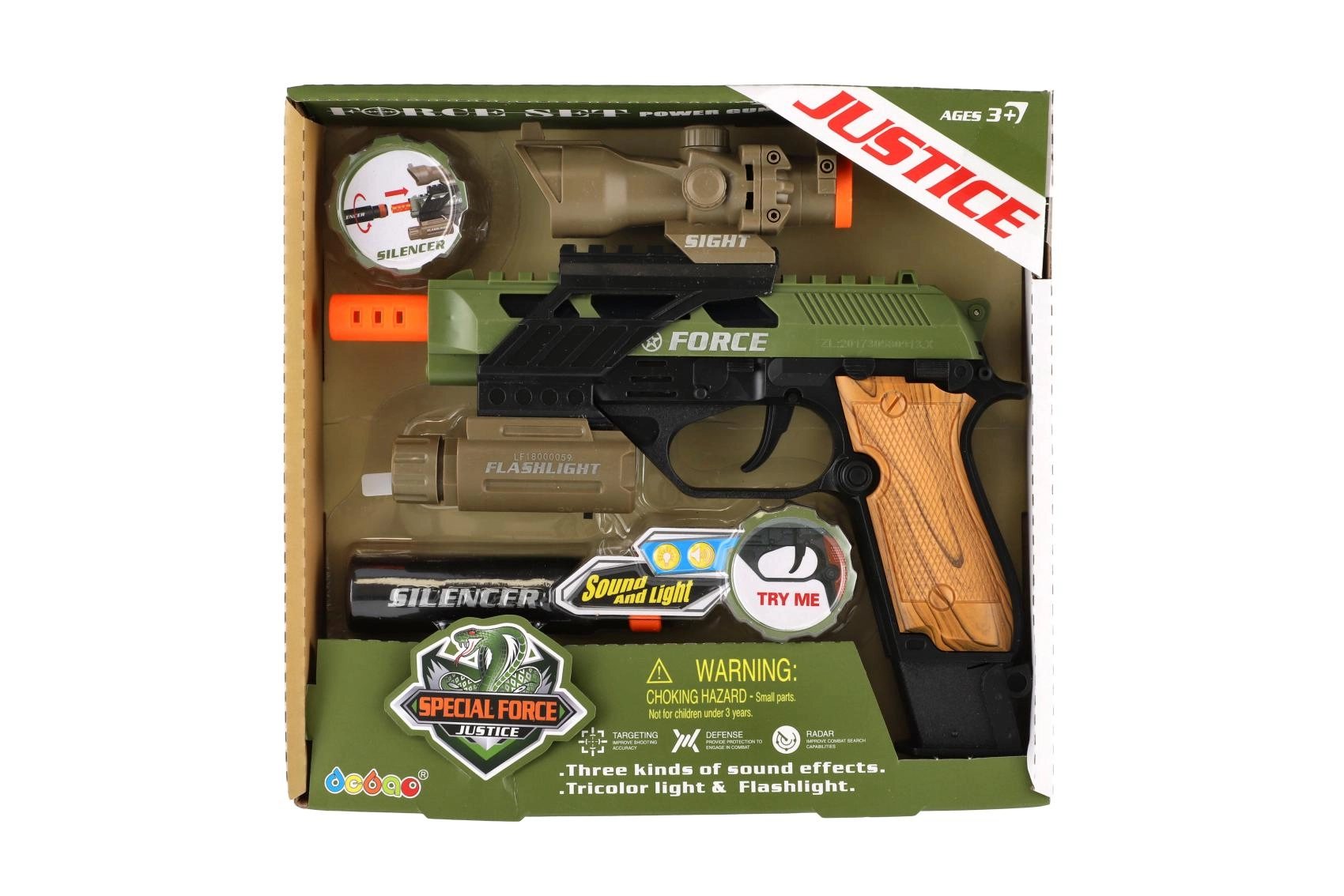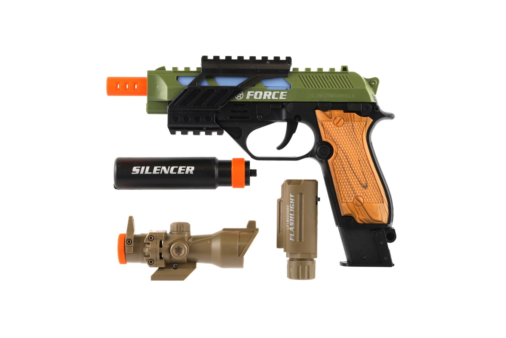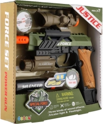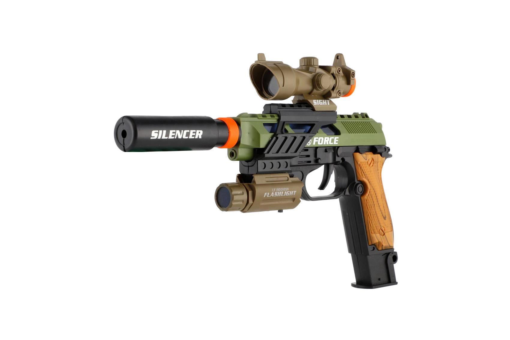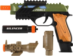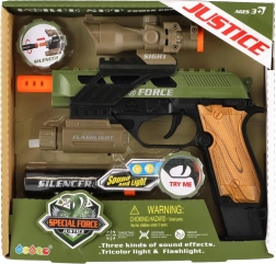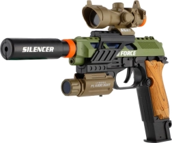 Ρεαλιστικό πλαστικό πιστόλι για μικρούς λάτρεις των παιχνιδιών δράσης. Προσφέρει φωτεινά εφέ, ηχητικά εφέ και πρακτικά αξεσουάρ όπως διόπτρα, φακός και σιγαστήρας. Λειτουργεί με μπαταρίες, οι οποίες περιλαμβάνονται στη συσκευασία.
