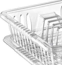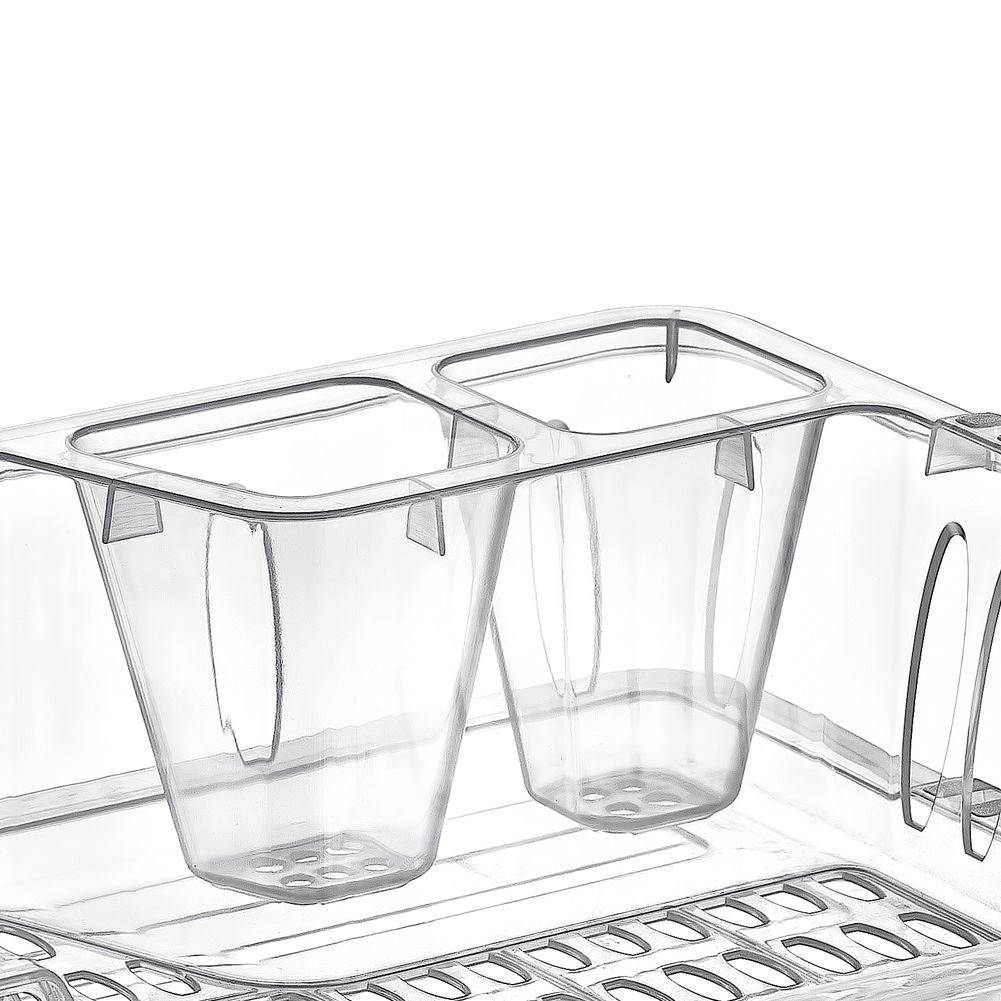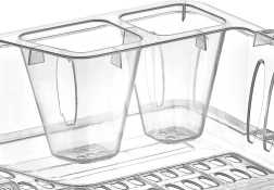 Μικρό και πρακτικό στραγγιστήρι πιάτων διαστάσεων 40 × 29 × 8,5 cm από ποιοτικό, διαφανές πλαστικό χωρίς BPA. Προσφέρει χώρο για πιάτα, κούπες και δύο θήκες για μαχαιροπίρουνα, διαθέτει αφαιρούμενο δίσκο αποστράγγισης για εύκολο καθάρισμα και προστατεύει τον πάγκο εργασίας από την υγρασία.