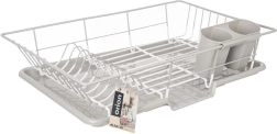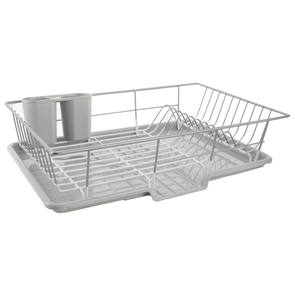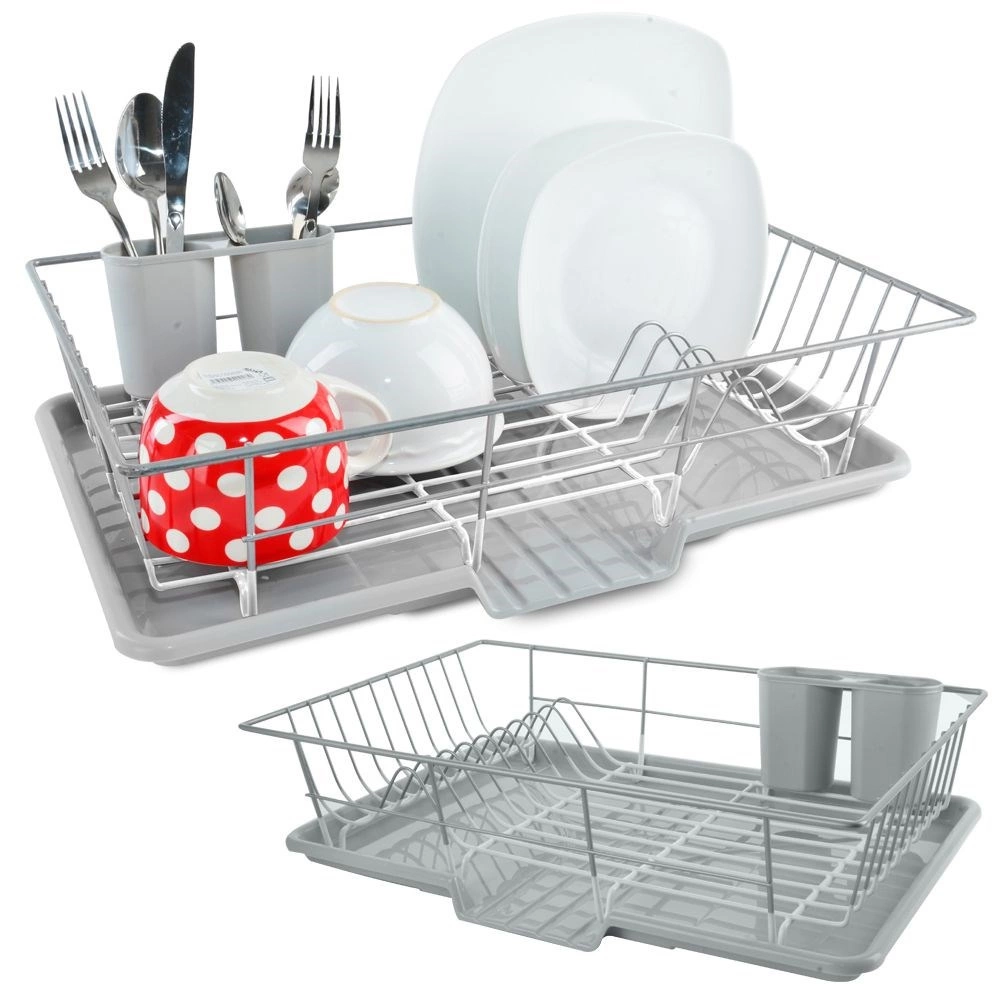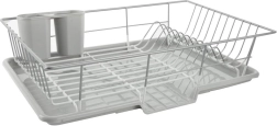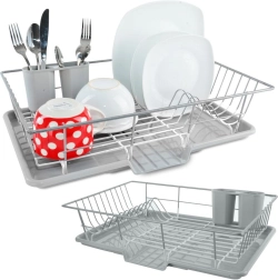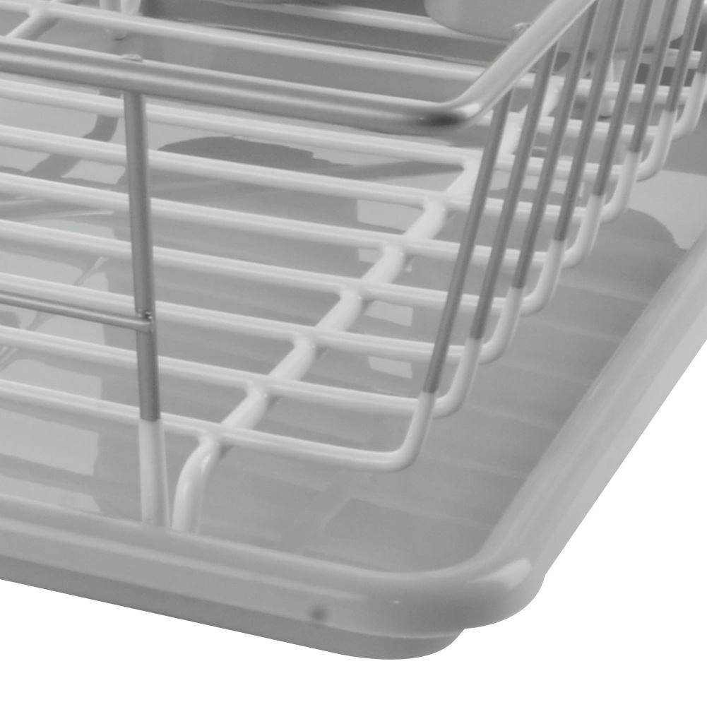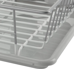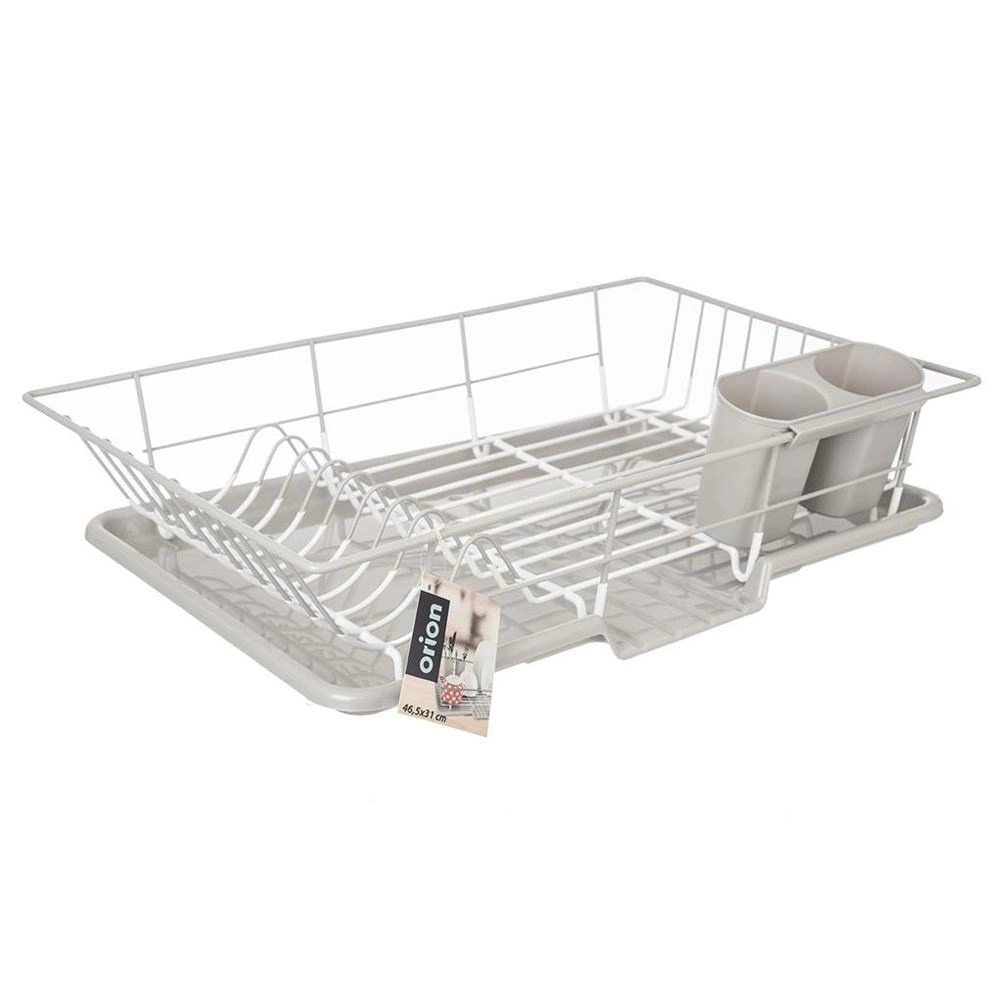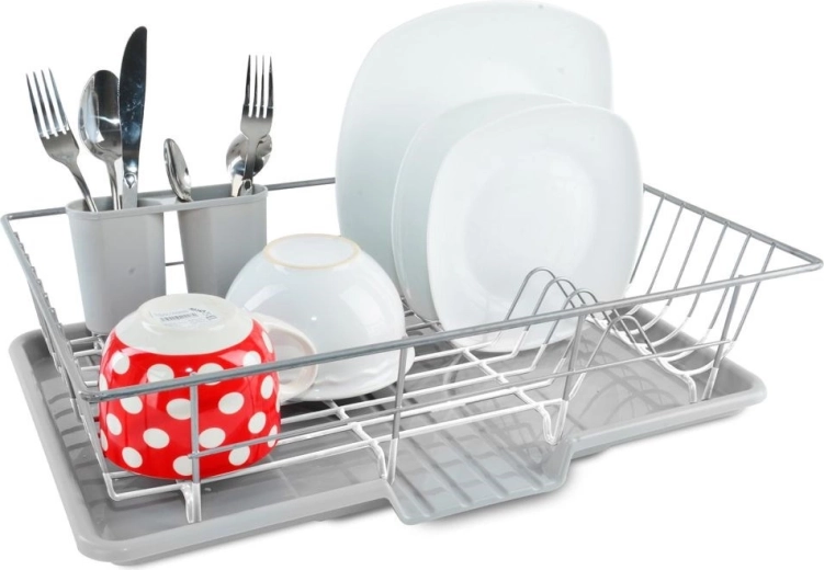 Κομψός και πρακτικός στεγνωτήρας πιάτων διαστάσεων 46,5 × 31 × 13 cm για άνετο στέγνωμα πιάτων, μπολ, ποτηριών και μαχαιροπίρουνων, χωρίς να λιμνάζει το νερό στον πάγκο. Η μεταλλική κατασκευή από ανοξείδωτο ατσάλι με γκρι-λευκή προστατευτική επίστρωση είναι σταθερή, ανθεκτική στη διάβρωση και εύκολη στο καθάρισμα.