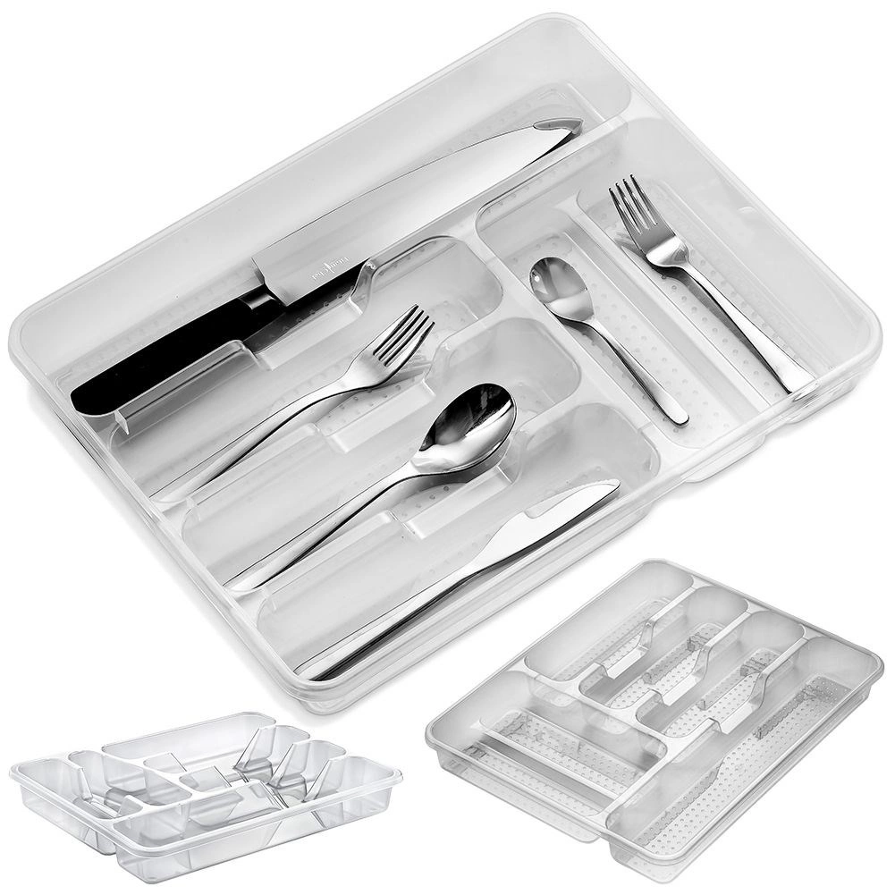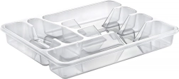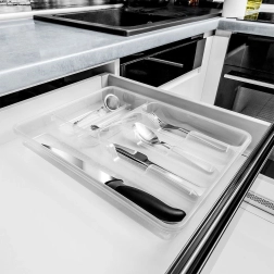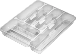 Πρακτικός οργανωτής για το συρτάρι της κουζίνας με διαστάσεις 38,5 × 31 × 5 cm, κρατά τα μαχαιροπίρουνα και τα μικρά εργαλεία σας τακτοποιημένα στη θέση τους. Χάρη στην διαφανή κατασκευή, έχετε πάντα τον έλεγχο του περιεχομένου, ενώ η στιβαρή δομή από ποιοτικό πλαστικό είναι ανθεκτική και εύκολη στη συντήρηση. Η εισαγωγή προσφέρει πολλαπλά διαμερίσματα για διάφορους τύπους μαχαιροπίρουνων και κουζινικών, είναι ευρύχωρη, πρακτική και κατάλληλη για κάθε μοντέρνα κουζίνα.