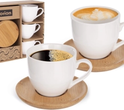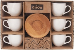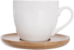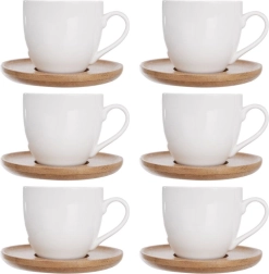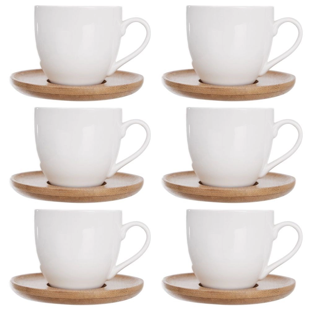 Έξι λευκά πορσελάνινα φλιτζάνια με ξύλινα πιατάκια αποτελούν ένα αρμονικό σύνολο και διακοσμούν κάθε τραπέζι. Ιδανικό για οικιακούς barista και ως δώρο.