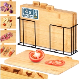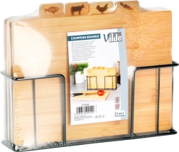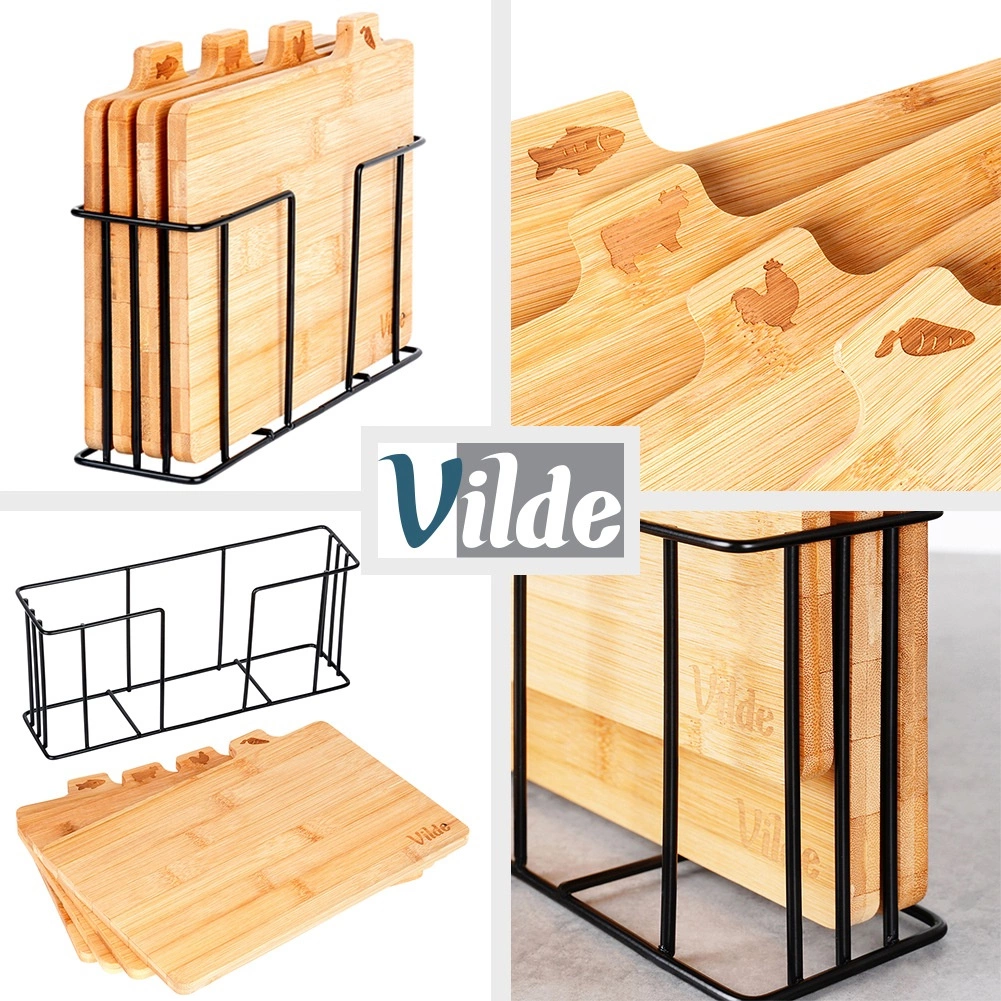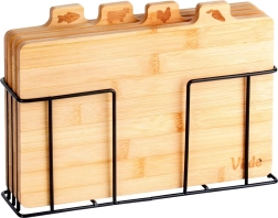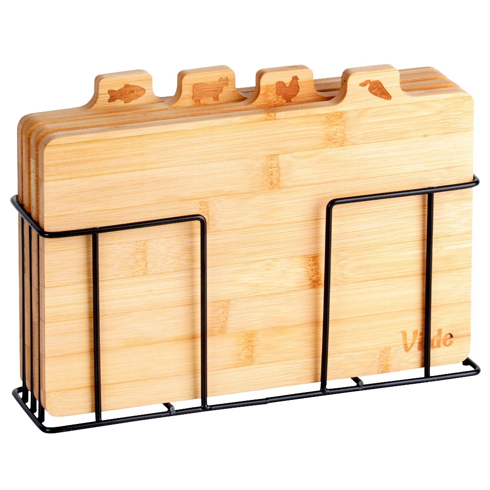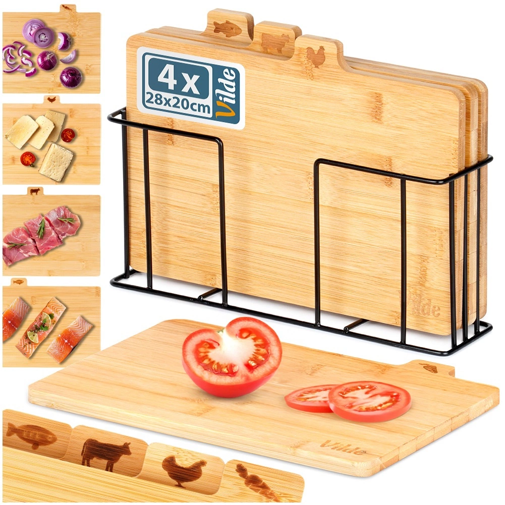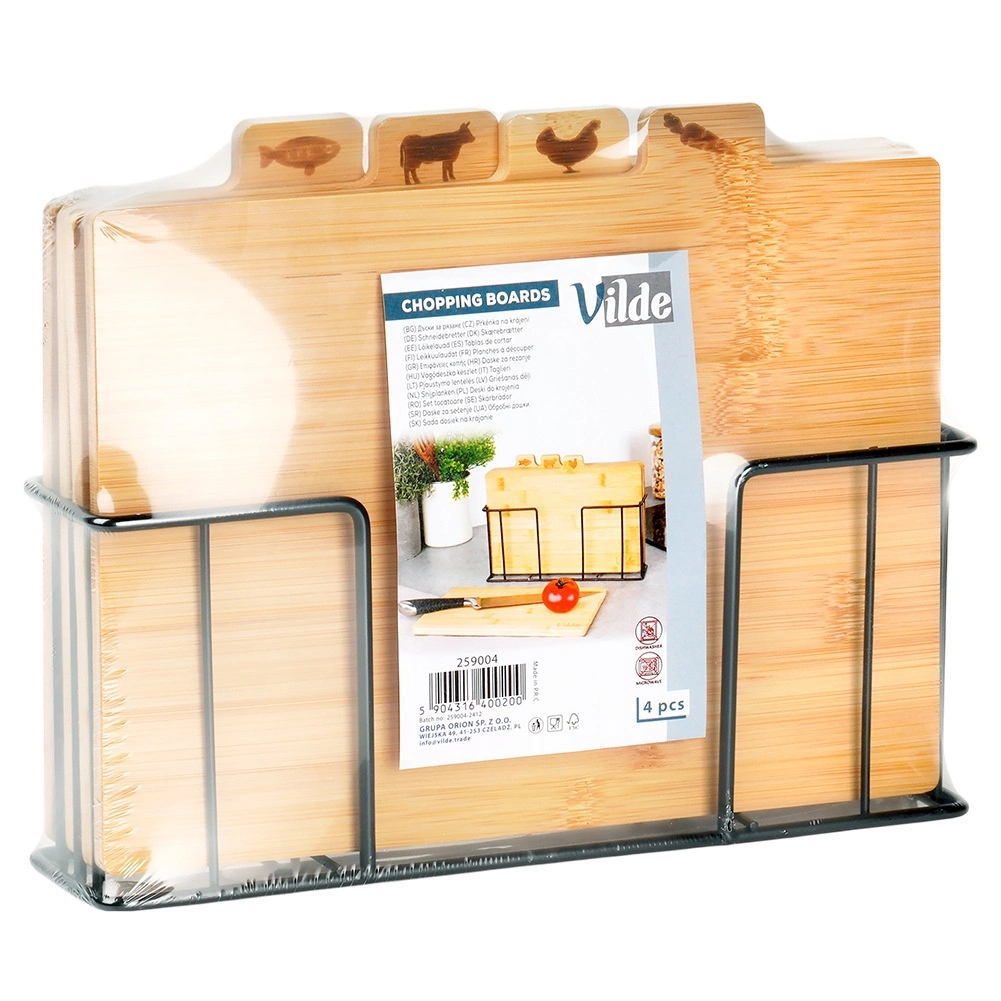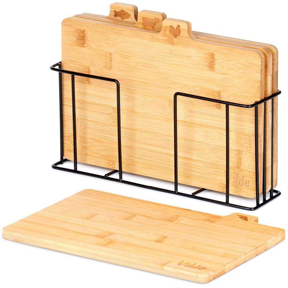 Με αυτό το σετ επιφανειών κοπής από μπαμπού θα κρατήσετε την κουζίνα σας σε άψογη τάξη. Τέσσερις ξεχωριστές σανίδες με πρακτικές γλωσσίδες και εικονίδια υποδεικνύουν ξεκάθαρα για τι προορίζονται – για λαχανικά, πουλερικά, κρέας και ψάρια – υποστηρίζοντας έτσι την υγιεινή προετοιμασία γευμάτων. Η σταθερή μεταλλική βάση σε μαύρο χρώμα εξασφαλίζει ότι οι σανίδες είναι πάντα πρόχειρες και τακτοποιημένες.