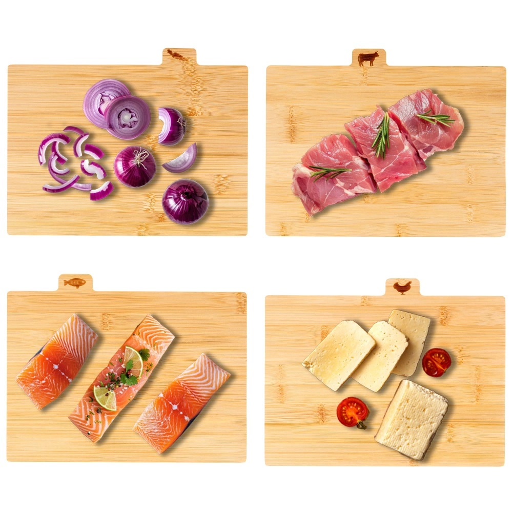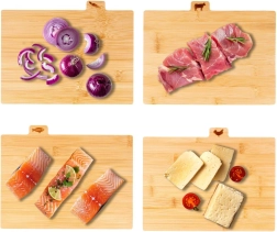 Κάθε σανίδα διαθέτει γλωσσίδα με χαραγμένο εικονίδιο για συγκεκριμένο τύπο τροφίμων – λαχανικά, πουλερικά, κρέας και ψάρια. Έτσι αποφεύγετε εύκολα τη διασταυρούμενη επιμόλυνση και διατηρείτε καθαριότητα στο μαγείρεμα.