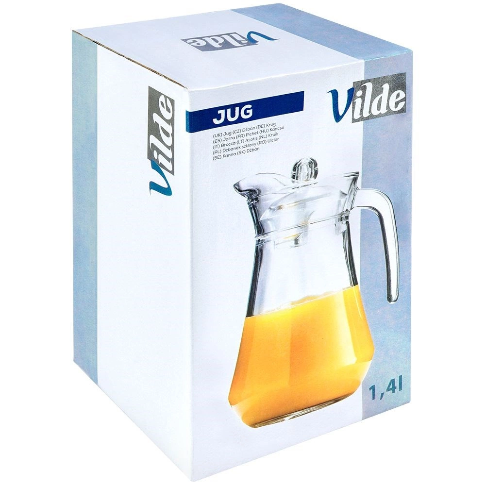 Κομψή γυάλινη κανάτα χωρητικότητας 1,4 l με πρακτικό καπάκι και εργονομική λαβή για άνετο σερβίρισμα. Ιδανική για νερό, χυμούς, λεμονάδα ή παγωμένο τσάι. Χάρη στο διαμορφωμένο στόμιο σερβίρει χωρίς να στάζει, ενώ το καπάκι προστατεύει το ρόφημα από ρύπους και έντομα. Κατάλληλη για πλυντήριο πιάτων και ψυγείο, για ροφήματα έως 60 °C.