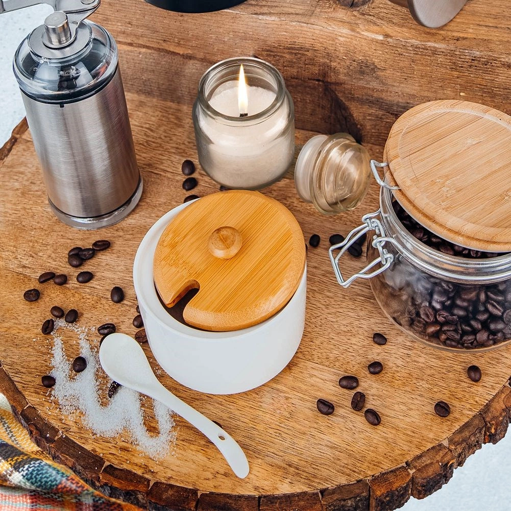 - Ποιοτικά υλικά – πορσελάνη σε λευκό, καπάκι από μπαμπού, πορσελάνινο κουταλάκι.