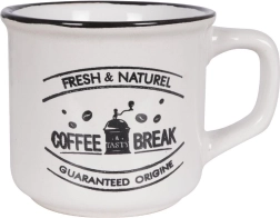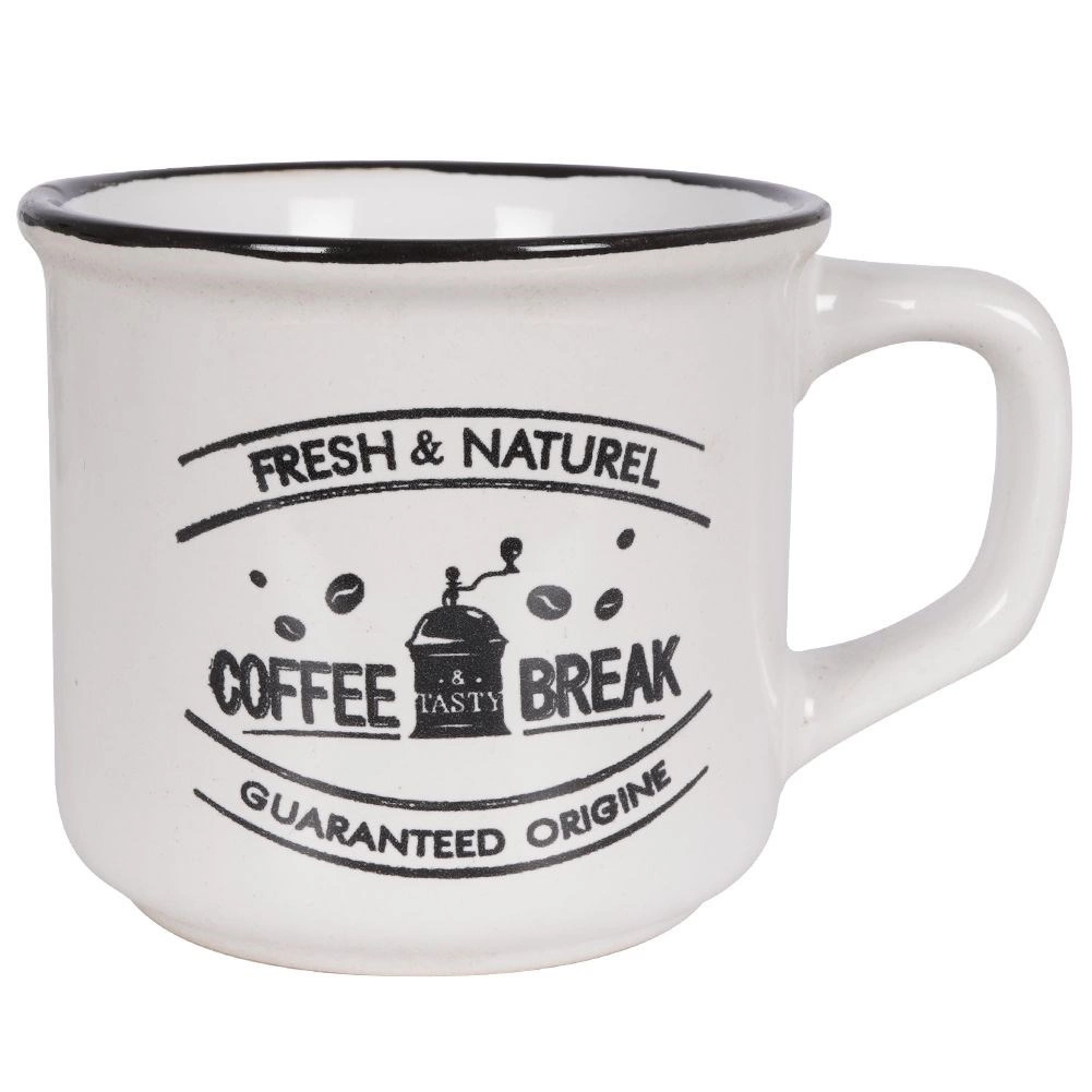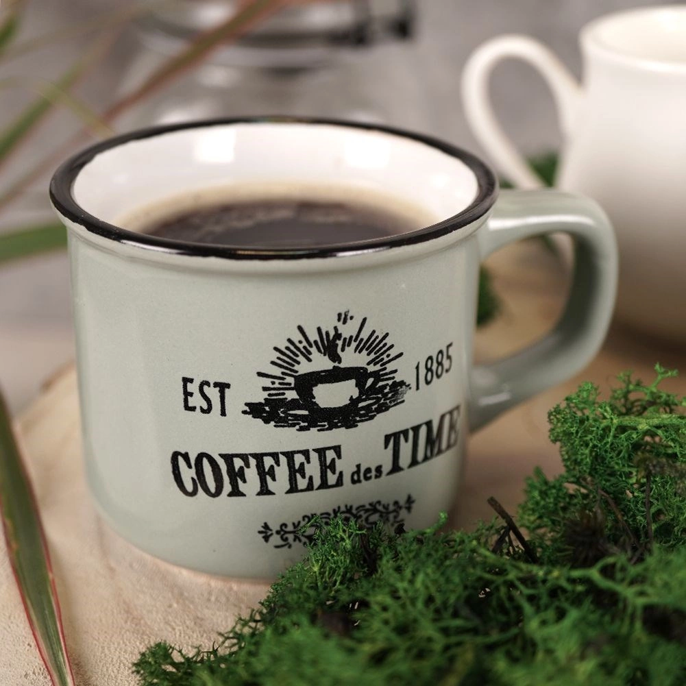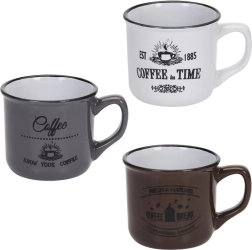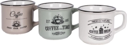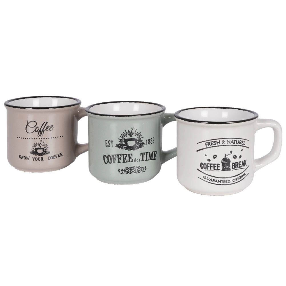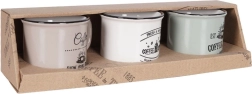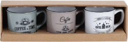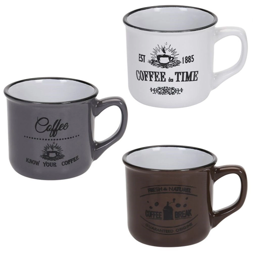 Στιλάτο σετ τριών κεραμικών κουπών χωρητικότητας 160 ml για τον καθημερινό καφέ, τσάι ή κακάο. Προσφέρει ποιοτική κεραμική, άνετη λαβή, δυνατότητα πλυσίματος στο πλυντήριο πιάτων και θέρμανση σε φούρνο μικροκυμάτων. Χάρη στα vintage καφεδάτα γραφικά και στο μαύρο περικάλυμμα ταιριάζει ιδανικά σε μοντέρνο και ρουστίκ στρώσιμο τραπεζιού.