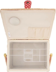 Στο εσωτερικό θα βρείτε αφαιρούμενο πλαστικό οργανωτή με 4 χωρίσματα για κλωστές, βελόνες, περαστήρια ή κουμπιά. Με την αφαίρεσή του αποκτάτε ευρύχωρο θάλαμο για μεγαλύτερα ραπτικά εργαλεία. Η εσωτερική πλευρά του καπακιού διαθέτει ελαστική τσέπη και μαξιλαράκι για βελόνες, ώστε να καρφιτσώνετε άνετα καρφίτσες και βελόνες. Το καλάθι είναι ιδανικό και ως οργανωτής κοσμημάτων.